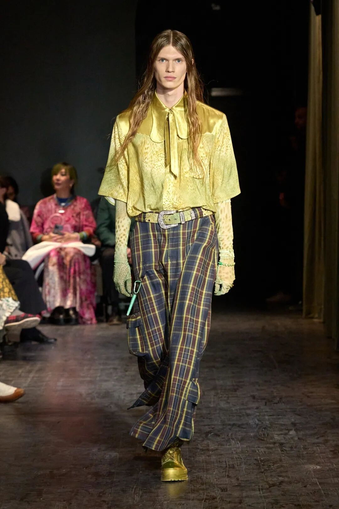 本季设计师在美国各地收集了废弃面料及可持续面料来,倡导生态平衡,保护动物。动物元素与随性垂坠服装完美融合,兽纹与格纹巧妙碰撞灵动活泼,天马行空的设计打造出丰富的层次感,将怪诞趣味演绎到了极致。