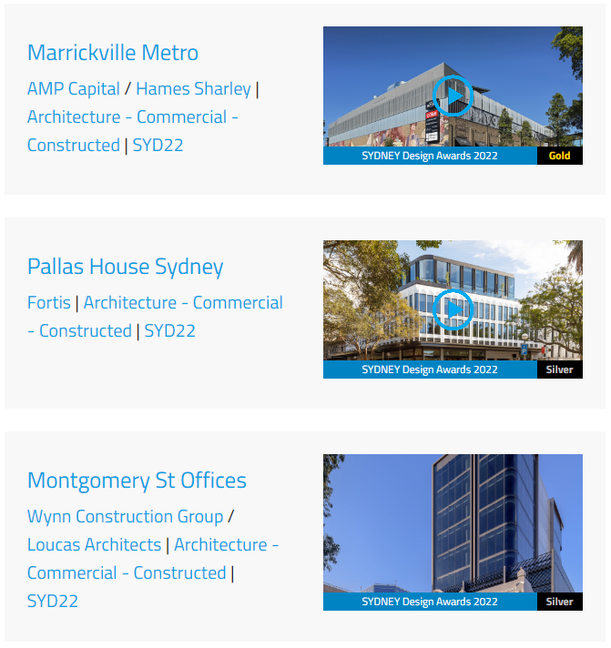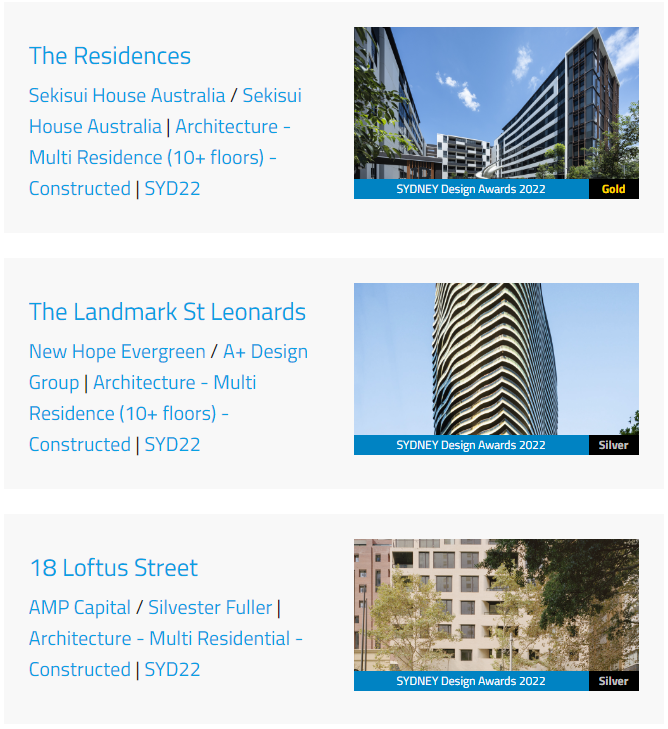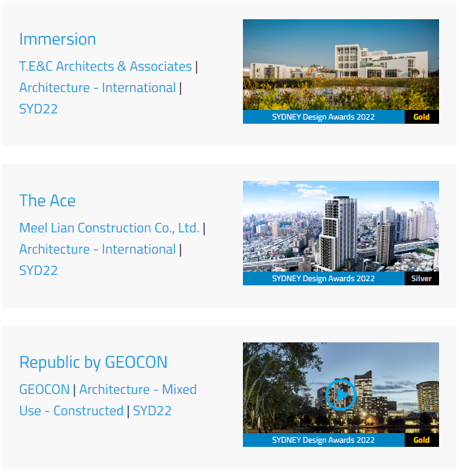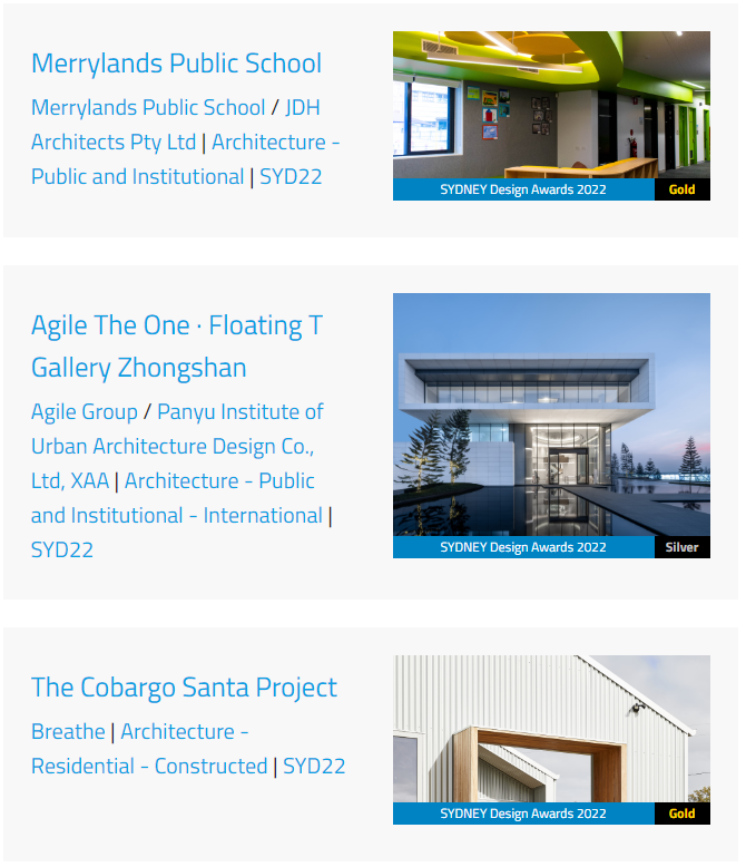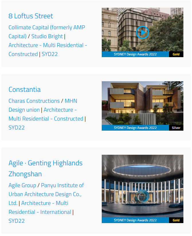 据奖项官方数据统计,2022 悉尼设计奖在国际类-建筑/室内/景观/城市设计4类中获得金奖的项目有17个,银奖项目有43个。