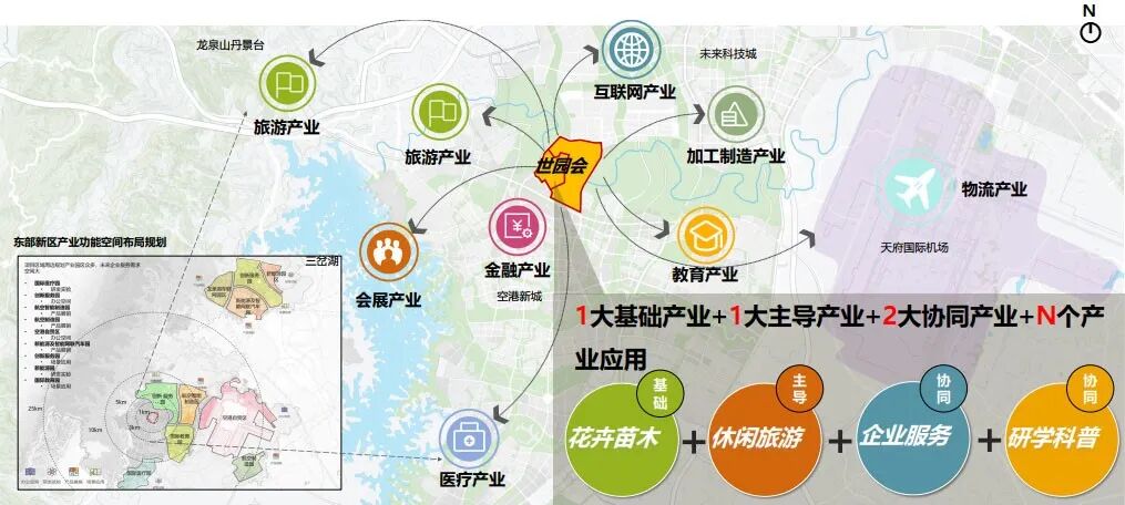 总体策划规划梳理城市产业功能空间格局,依托世园会IP,筛选出以花卉苗木为基础,以休闲旅游为主导,以企业服务与研学科普为协同的1+1+2+N产业体系,构建新区产业链,构筑产、学、研、游、居五位一体的后世园时代城市片区协同发展新格局。