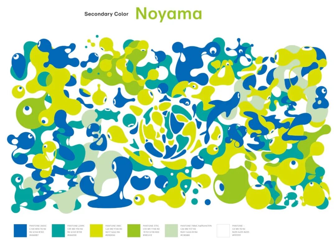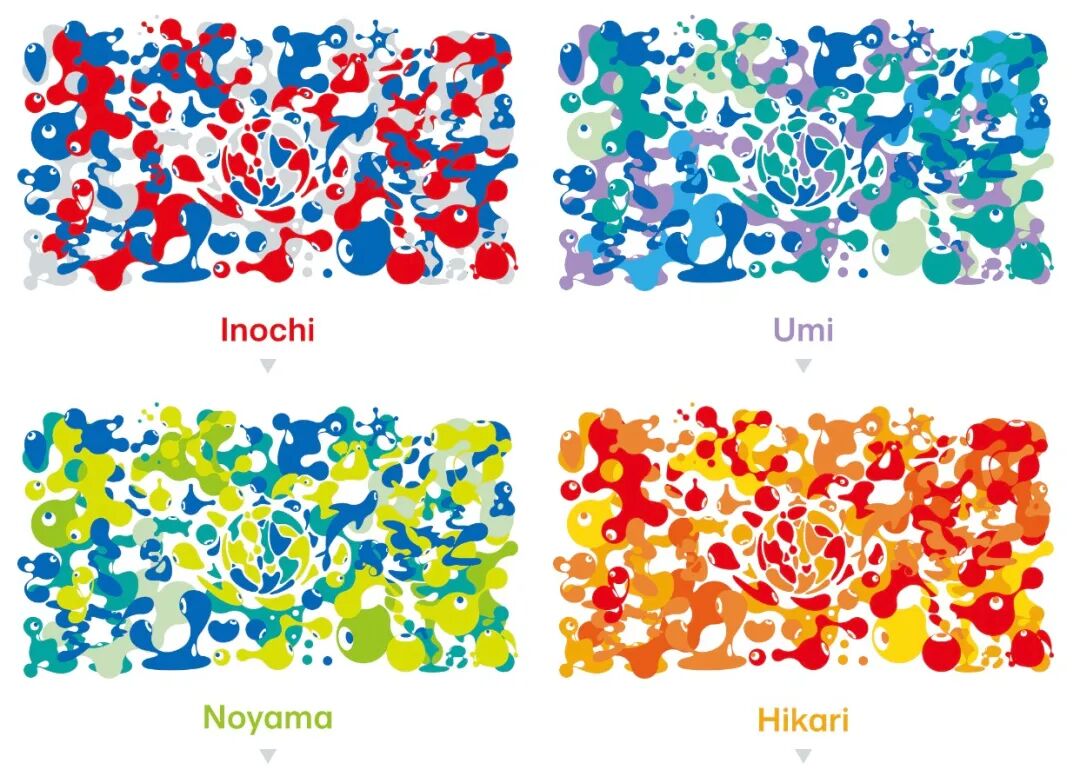 象征未来生态系统的“WORLD”,正如我们眼中所看到的世界,是如此充满多样性,因此这个设计元素也有多种表现形式,包含以Logo红蓝色为主的Inochi(生命),以及带出Umi(海洋)、Noyama(野山)、Hikari(光)意象的辅助色。