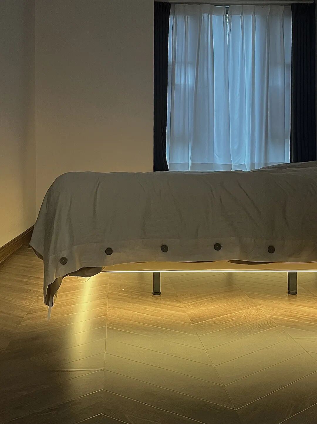 天用设计:环绕式的感应式灯带,分布于床头及床底,适老化的设计保证长辈起夜时的安全。