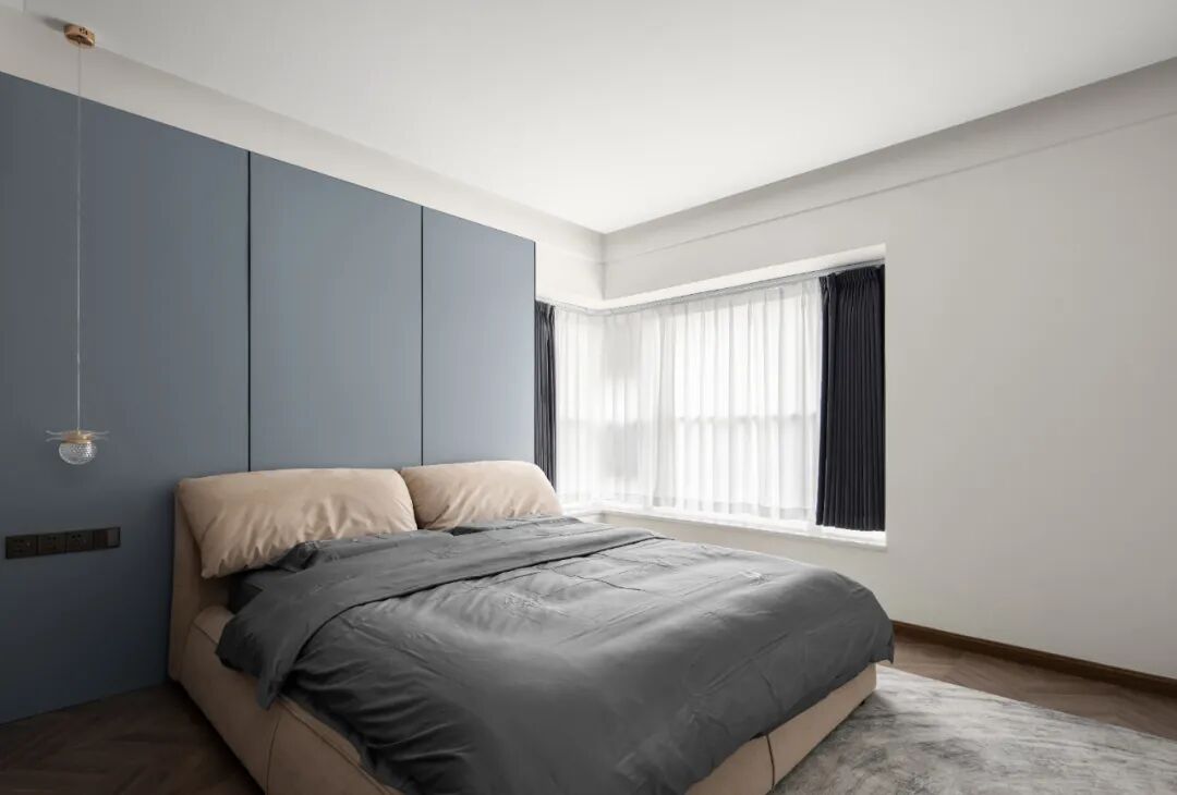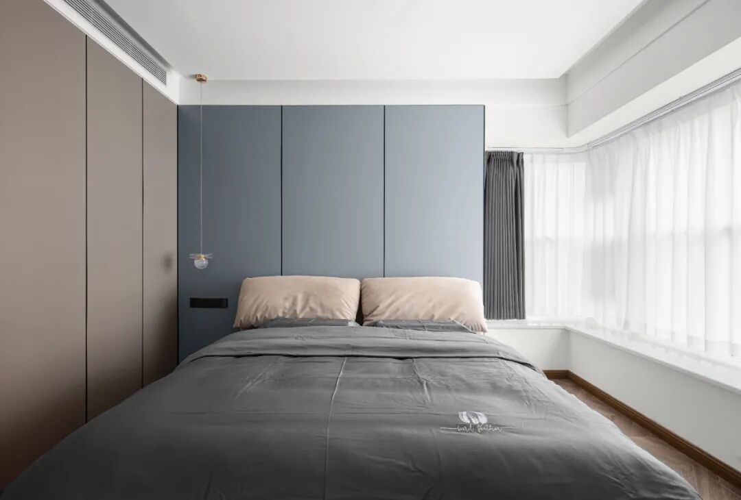 天用设计:主卧整体采用的是雾霾蓝与浅棕色的搭配,微妙的色差可以起到助眠的作用。