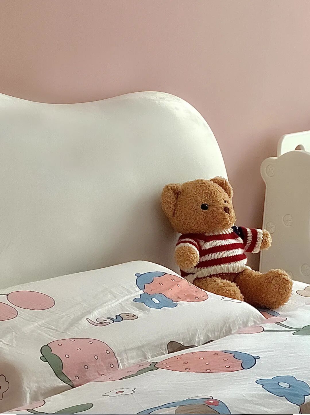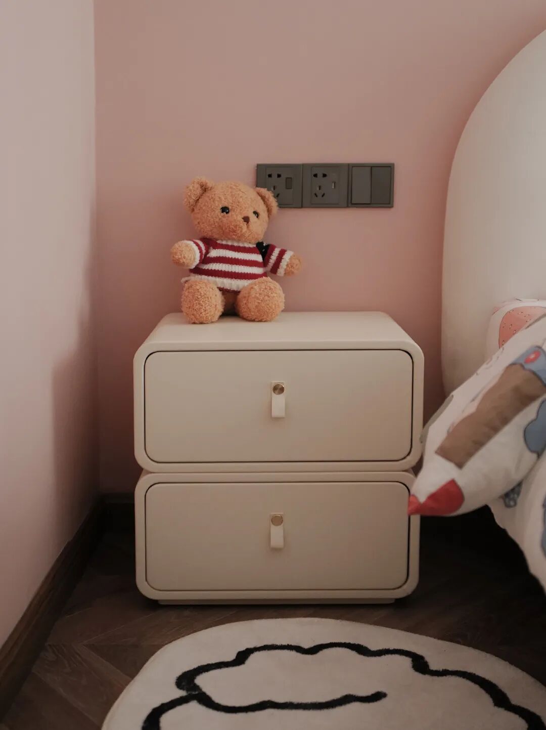 天用设计:藕粉色的背景墙,可爱的云朵造型软包床头,及皇冠灯饰,都是业主夫妇俩精挑细选出来的,为的就是给孩子打造一个梦幻小天地。