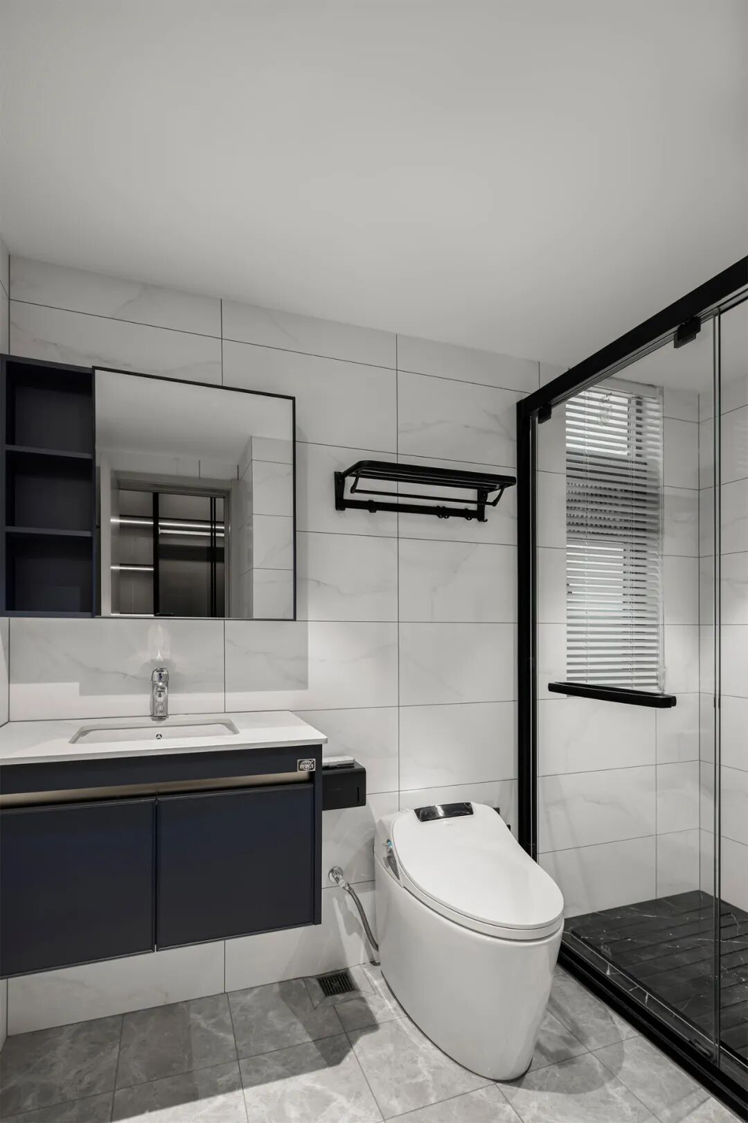 天用设计:主卫和衣帽间共处一室,推开衣帽间的隐形门则到达主卫,流畅的洗漱、换衣、休息动线,让生活效率更高。