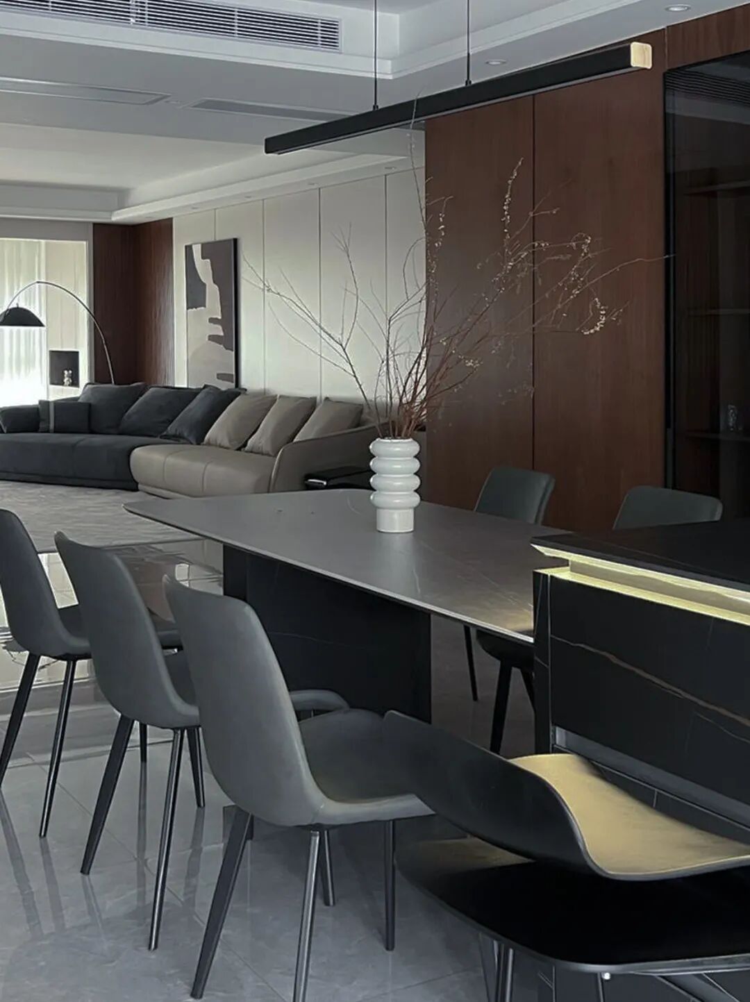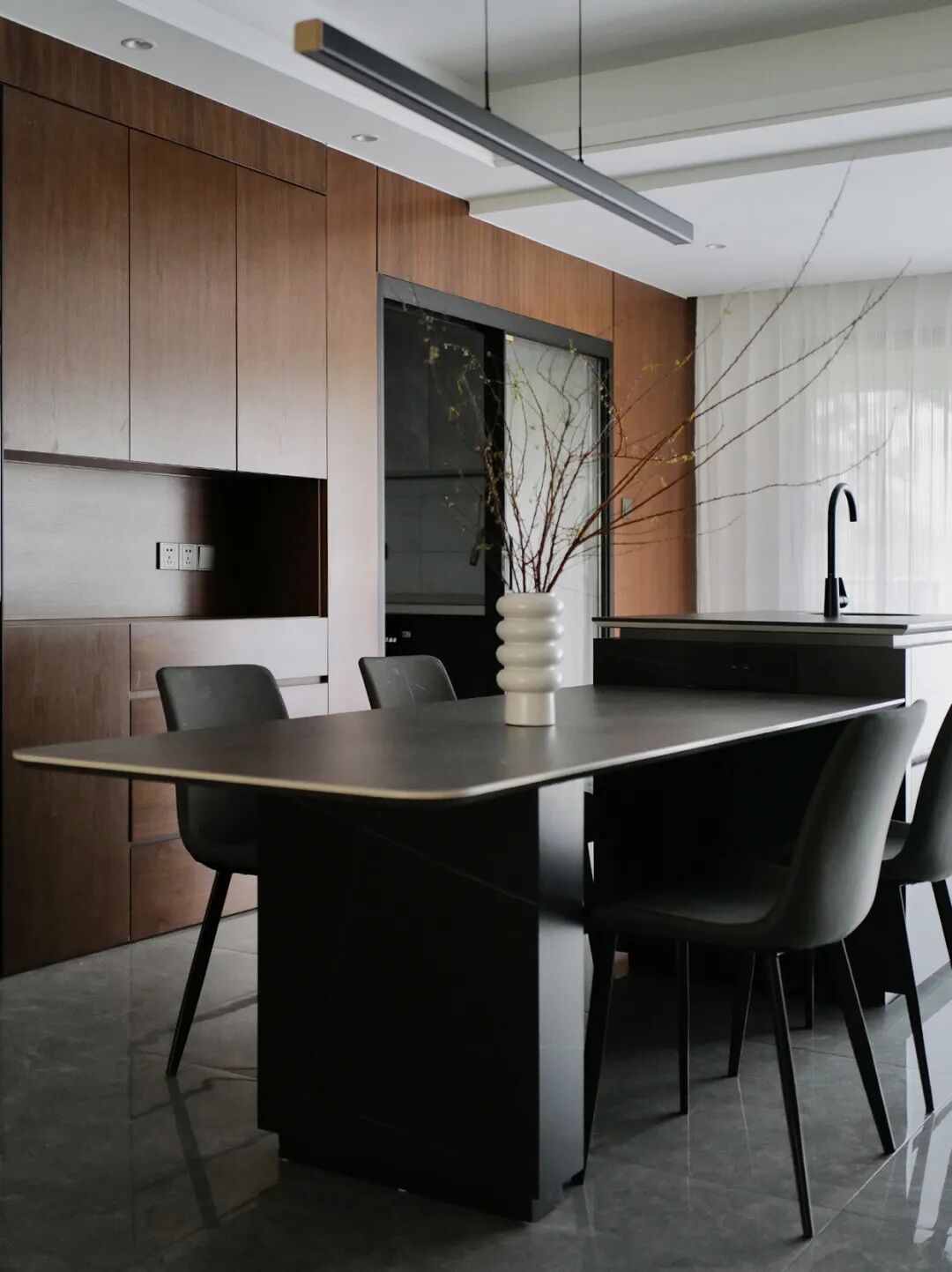 天用设计:家族成员多,常有亲朋好友来聚餐,所以选择了款式较长的餐桌,可以延长视野,平常也能置物。