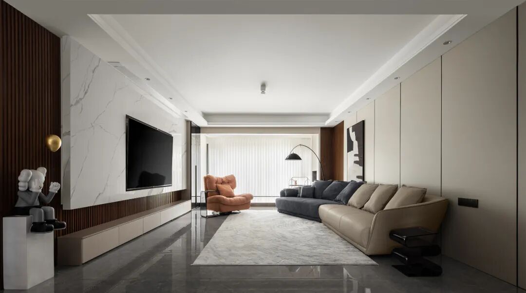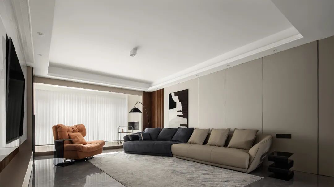 天用设计:客厅中无法拆除的梁位,我们都用了吊顶将其做修饰,再加上灯带的嵌入,均匀光线分布之外也不压层高。