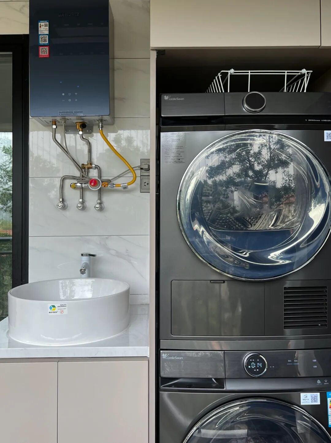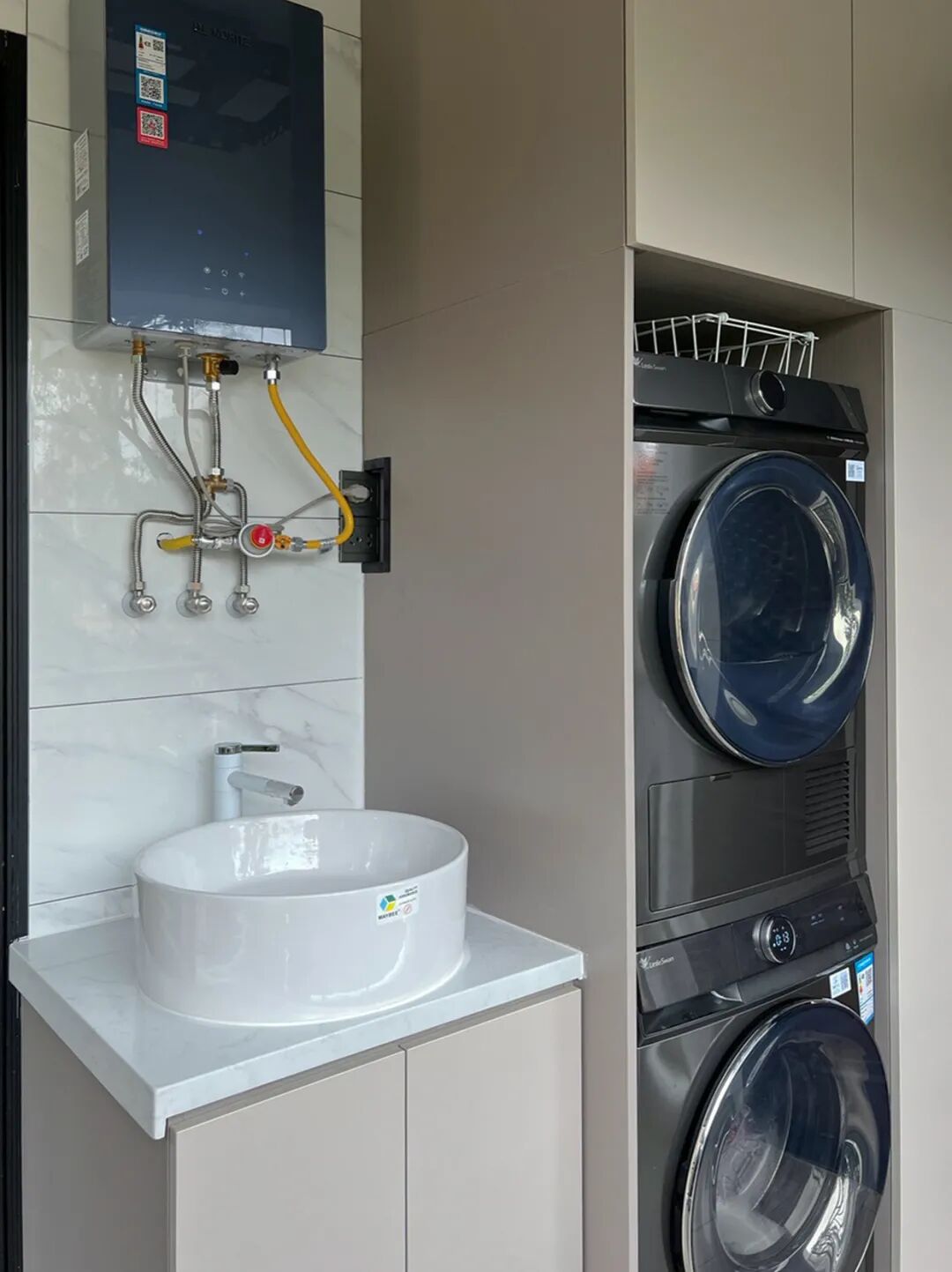 天用设计:洗烘衣机叠放,节省空间,装修时切记要预留插座及散热的位置。软水机与净水机“藏身”于洗衣机旁边的家政柜里,即使是小空间也要一丝不剩用起来~