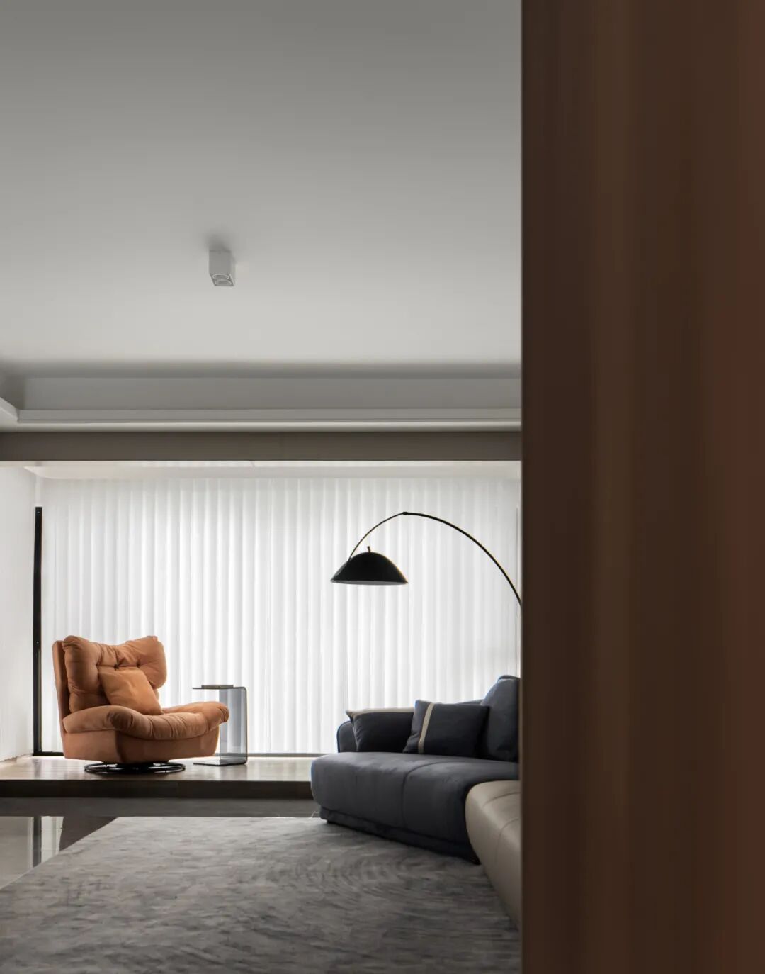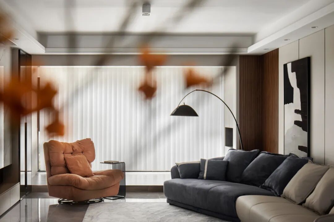天用设计:原户型就拥有超大阳台,视野开阔,索性将其打通纳入客厅,再抬高200mm打造地台,高低错落划分功能区。
