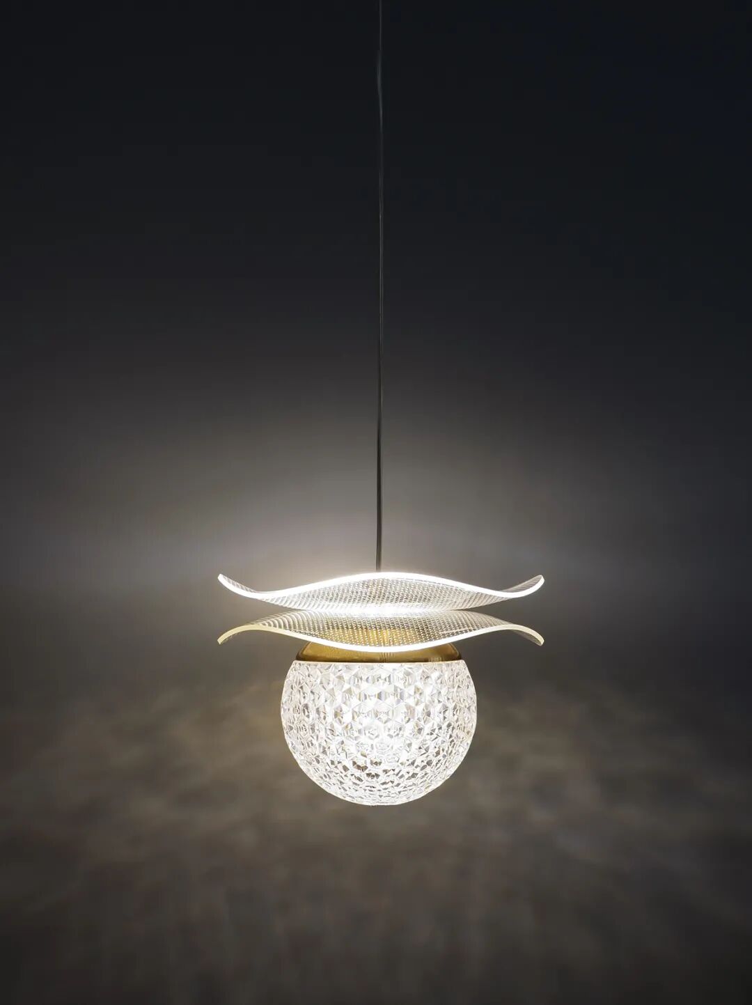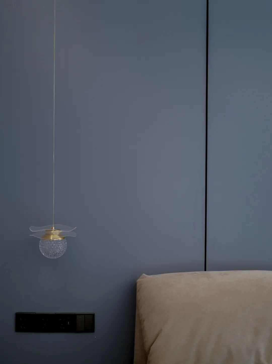天用设计:床边是一盏荷叶边吊灯,立体切割的灯体,为室内空间增添了一丝灵动。