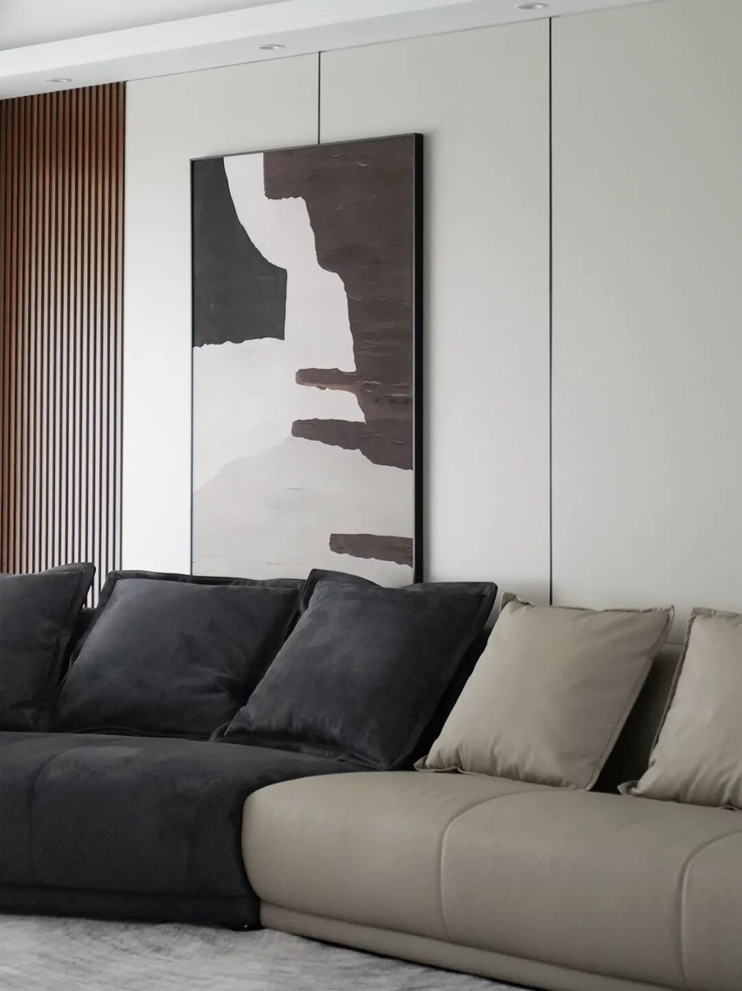 天用设计:组合型的沙发,一边是耐磨亲肤的磨砂布,另一边则是皮质的面料,不同材质带来不一样触感,可以满足不同季节和不同访客的需求。