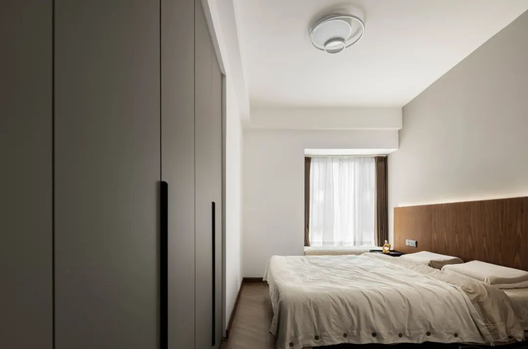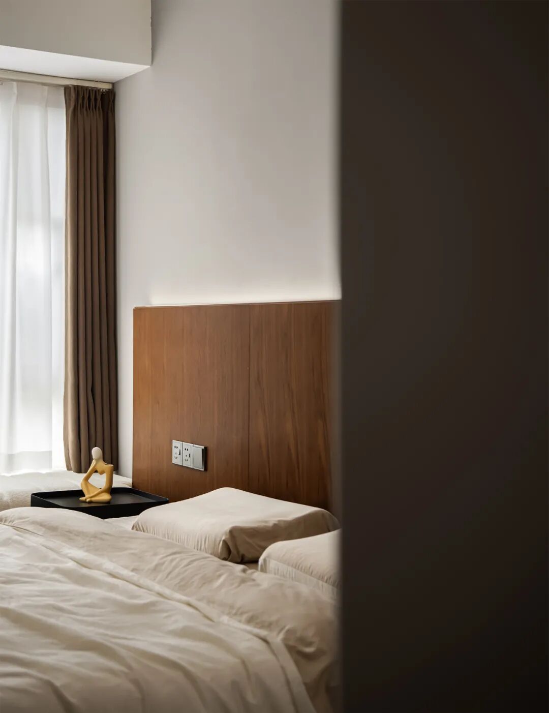 天用设计:无床头的设计,以木制背景板为床靠背,减少了空间的束缚感。