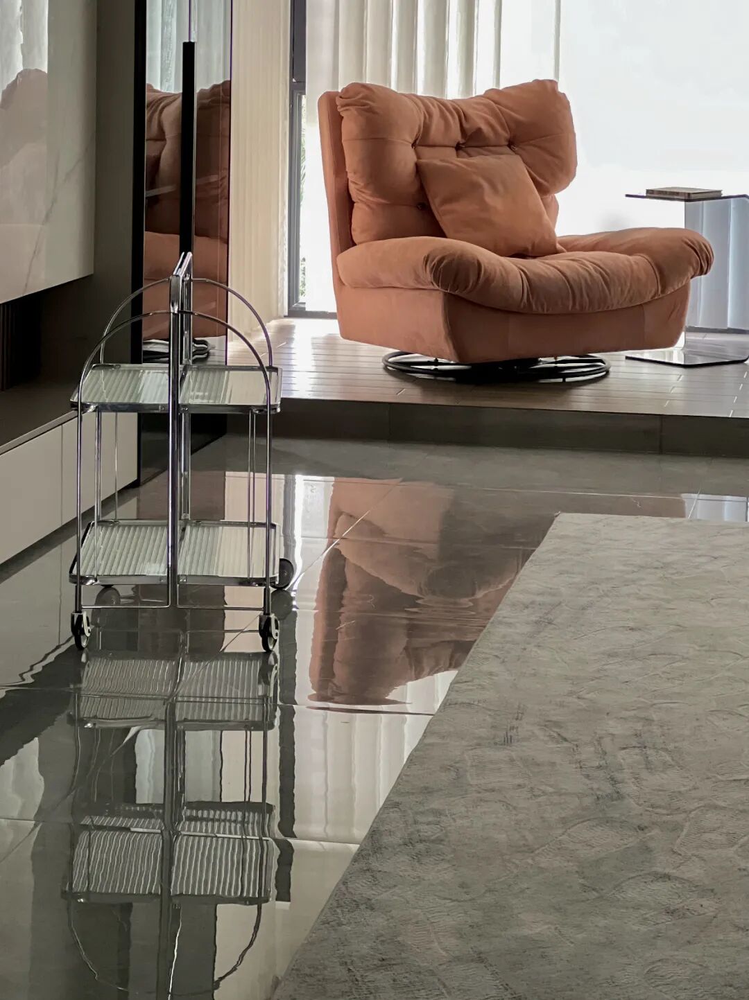 天用设计:再用小边几及推车代替茶几来置物,可以灵活移动之余,还能留出更多空间给孩子活动。