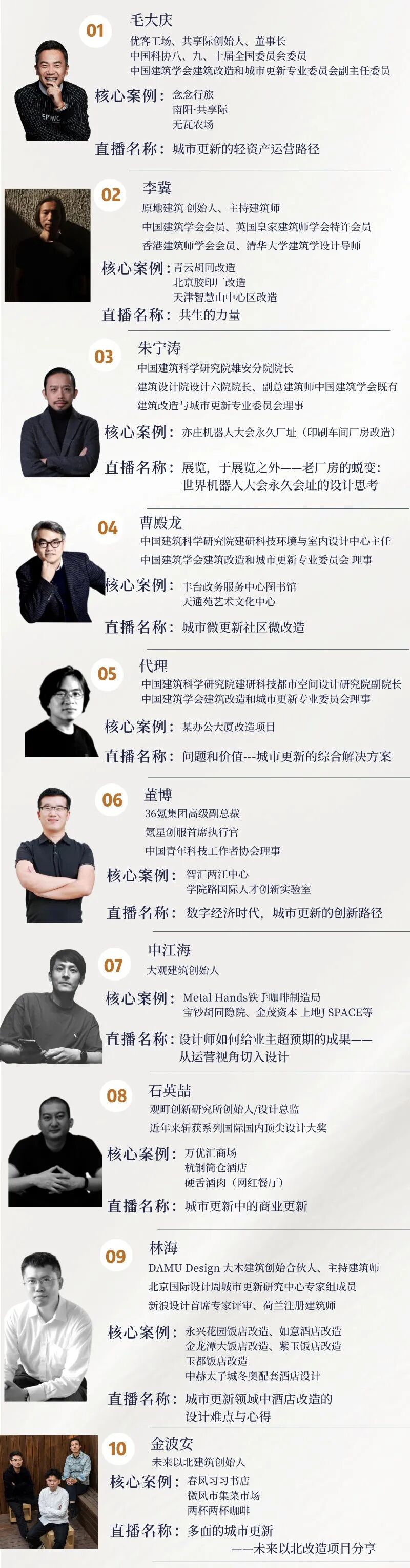 10位专家全案例分享,每周2次直播,从城市更新的不同建筑改造方向讲解策划及设计相关内容,专家简介及直播和核心案例名称如下所示:(专家排名不分先后)