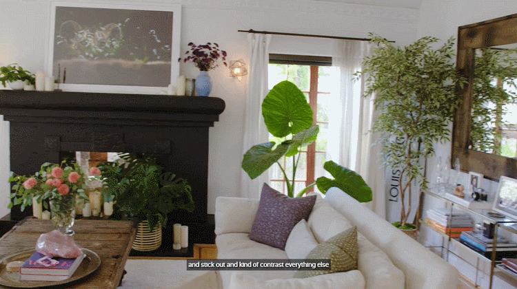 室内的绿植也是一大特色,靠近阳光的窗边摆着高大的散尾葵、另一头的窗边是叶片宽大的海芋,墙角有一棵橄榄树,壁炉前养了一盆龟背竹,茶几上插了一瓶鲜花……整个家充满生机。