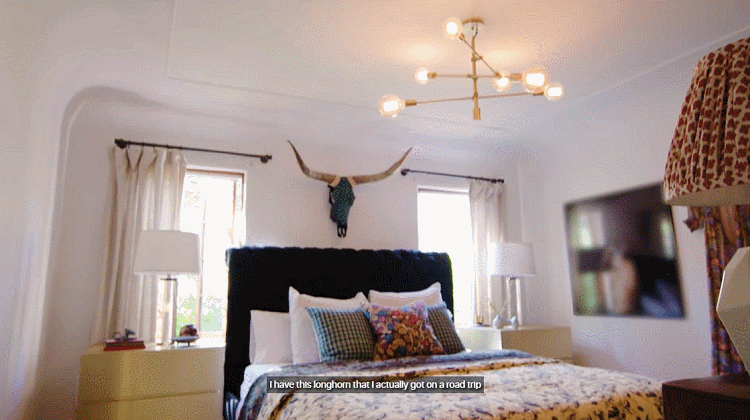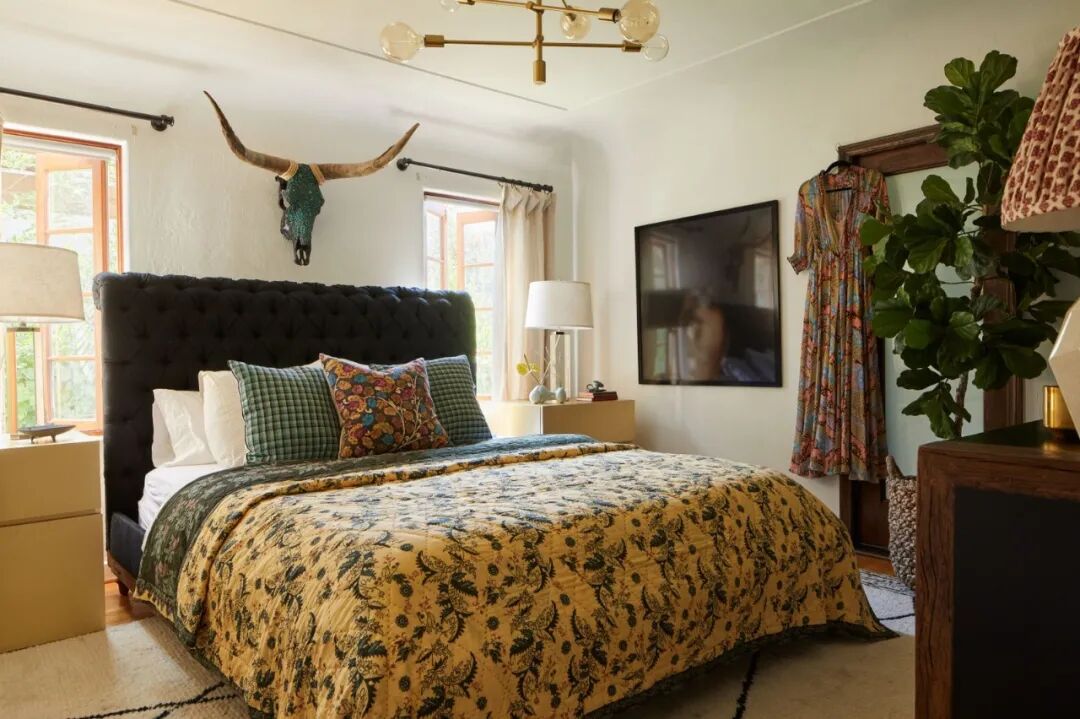 卧室里装点着各种复古、传统的小物件,让整个房间充满丰富的气质。挂在床头的牛角,是妮娜自驾游时在路边摊买的,如今成了整间房子的中心装饰物。