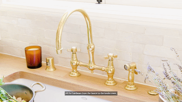 牛油果绿的橱柜,搭配实木的台面,其他金属的器具包括门把手、水龙头用了金色突出,这个配色怎么看都很绝!