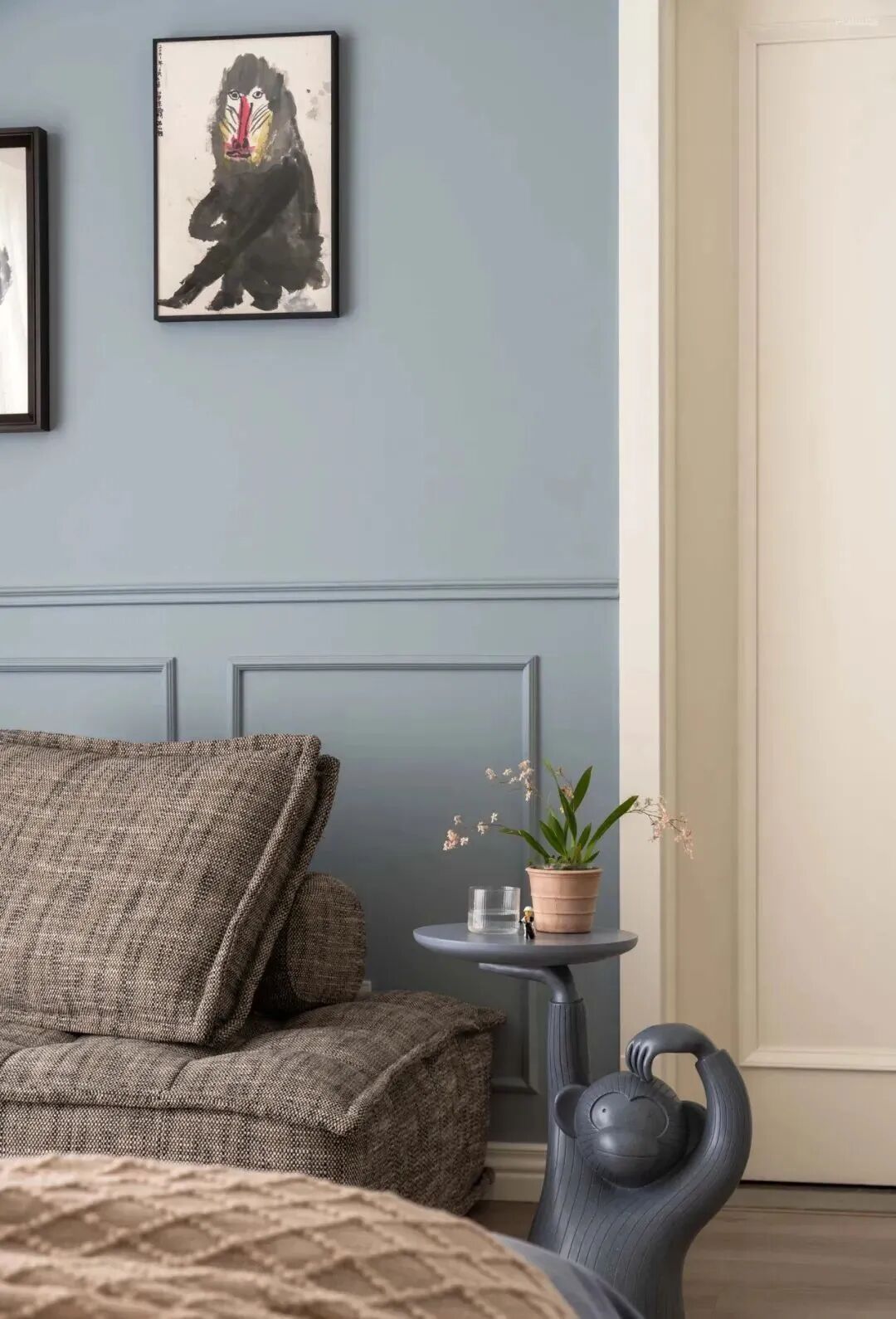 餐边柜上的特别选择了有博物馆气质的壁灯,凸显出整个家不凡的气质。经典的藤编高背椅既平时可以当装饰品,周末大儿子回家,一家人聚餐的时候也可以当正式的餐椅去使用。