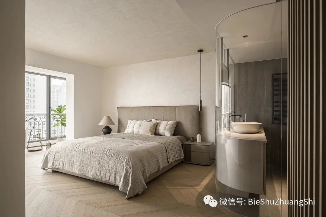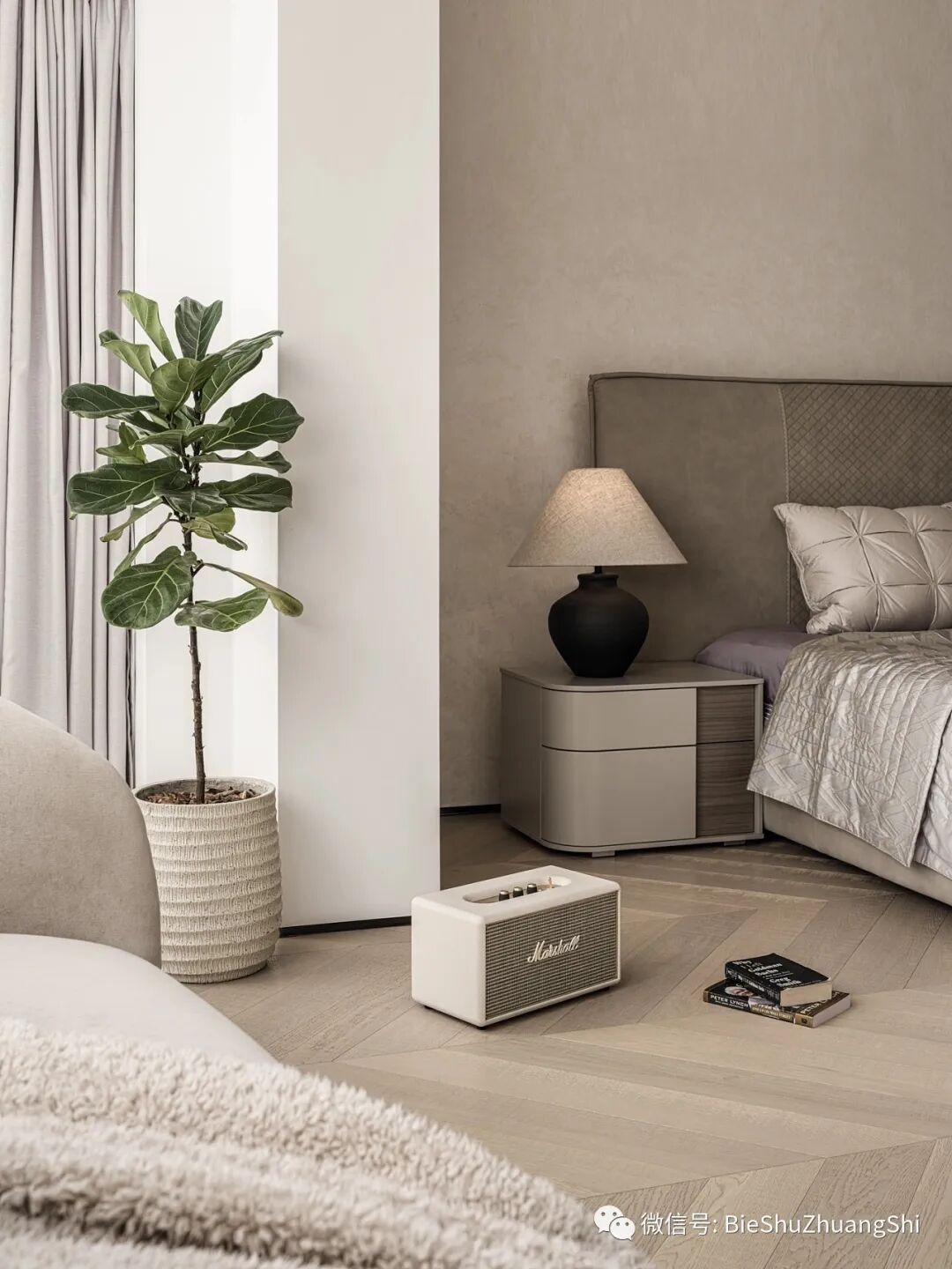 卧室将简素发挥到极致,利用几近相同的质感,产品,层次作为美学载体,甄选偏灰质的面料,平复空间情绪,让空间语素回归本真,令人快速入眠。