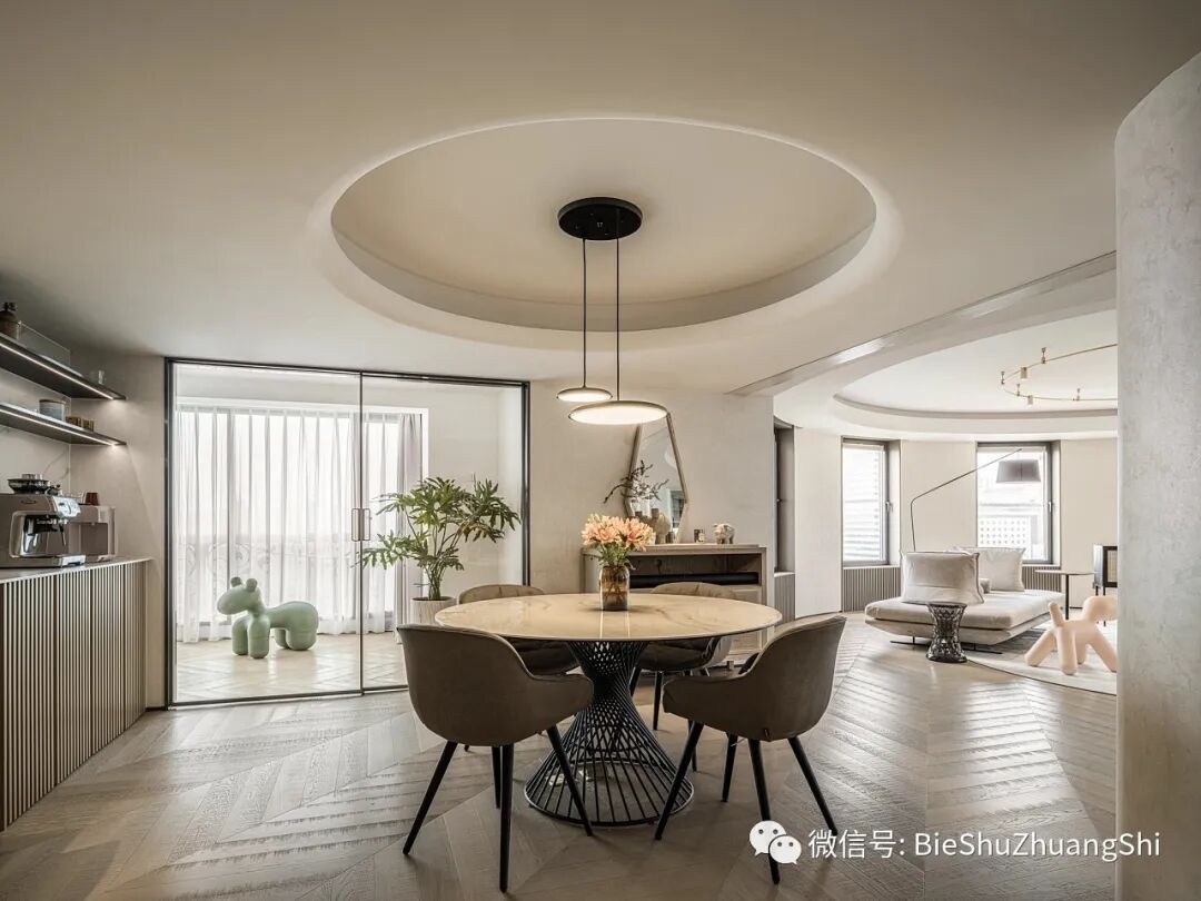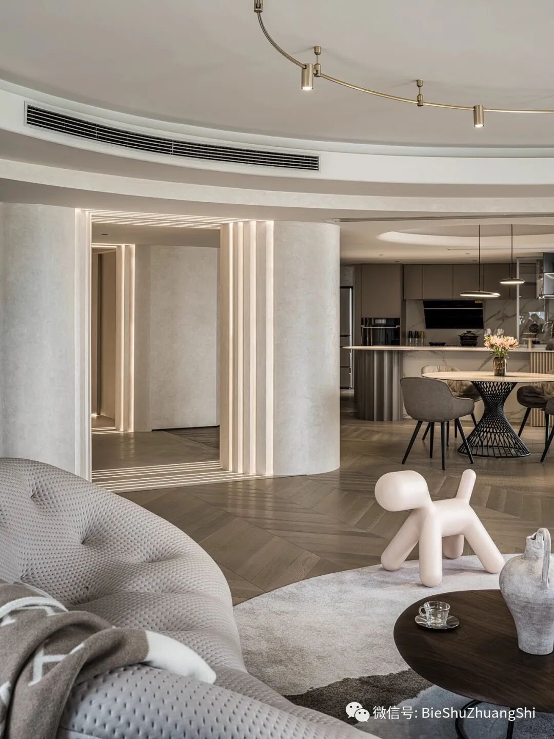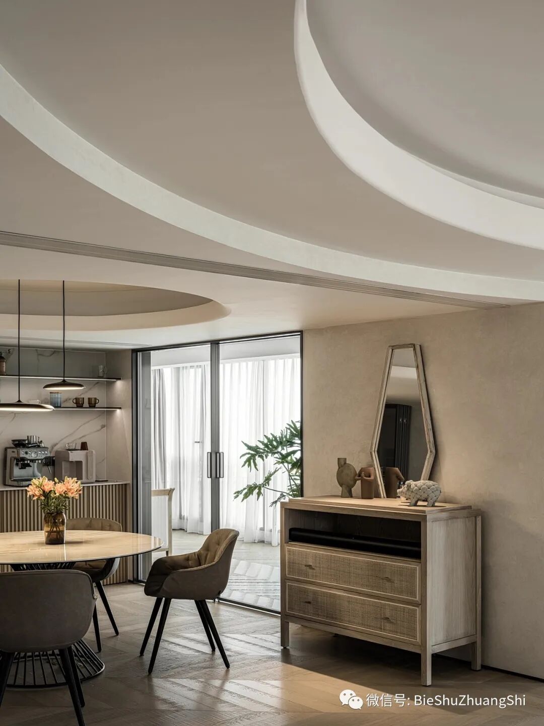 诗意的空间在客厅逐渐延展,随着时间的不断变化,家的温度也慢慢升温,设计着力提升整体的格调,吊顶、地板,圆弧等等,表现出饱满、稳定的视觉效果。