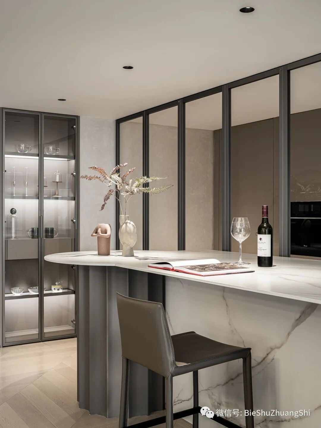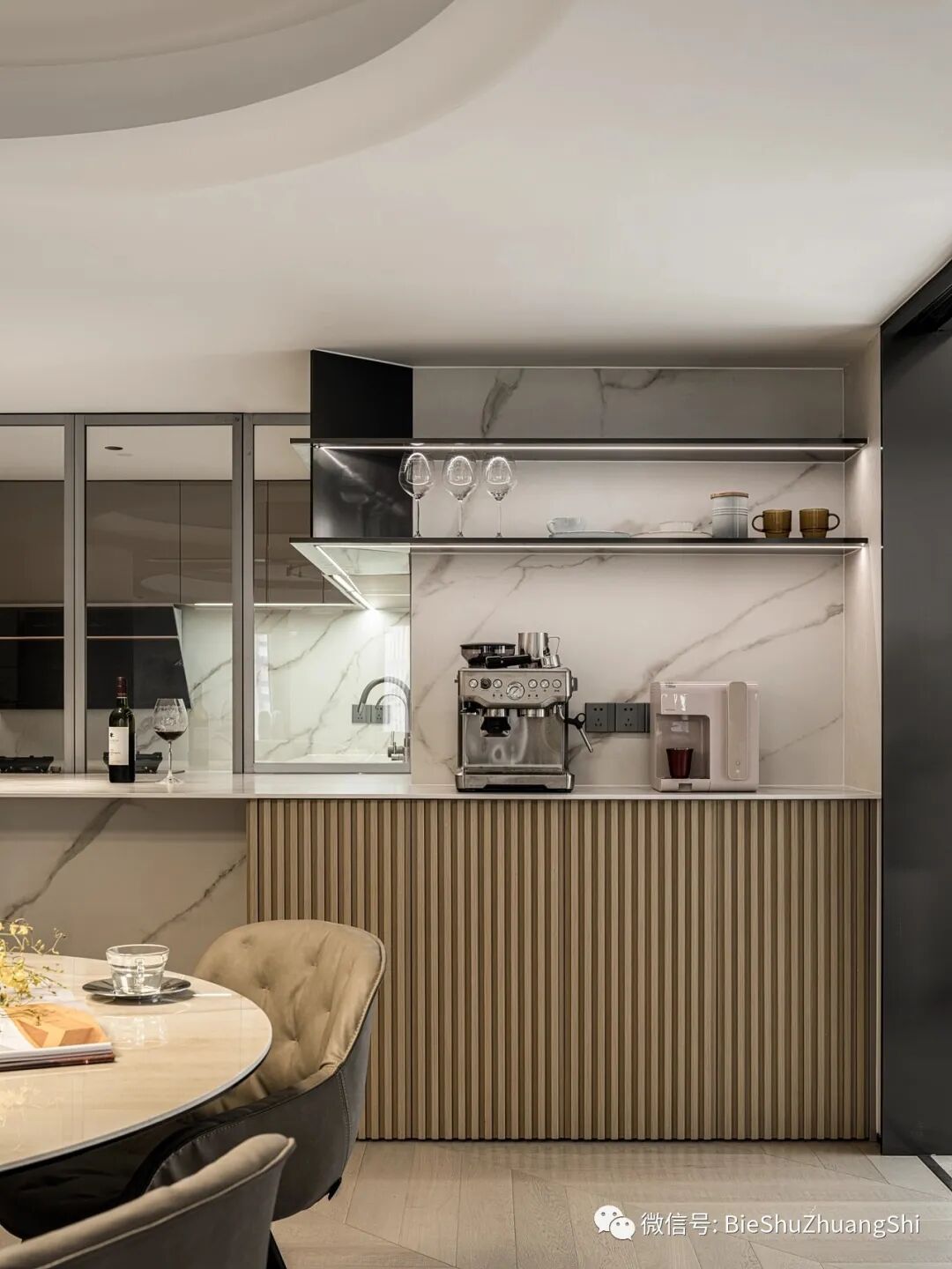 孔灯的设置,使其聚焦在同个地方,在光线和人影的叠加之中,将吧台完全覆盖,是对自在生活的隐喻,一侧酒柜安装玻璃门,并搭载灯光系统,兼顾美观与实用,增加生活小资情调。