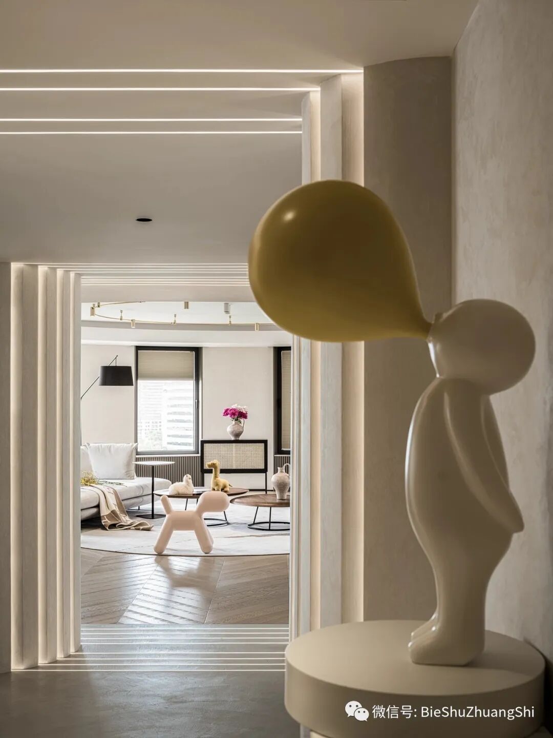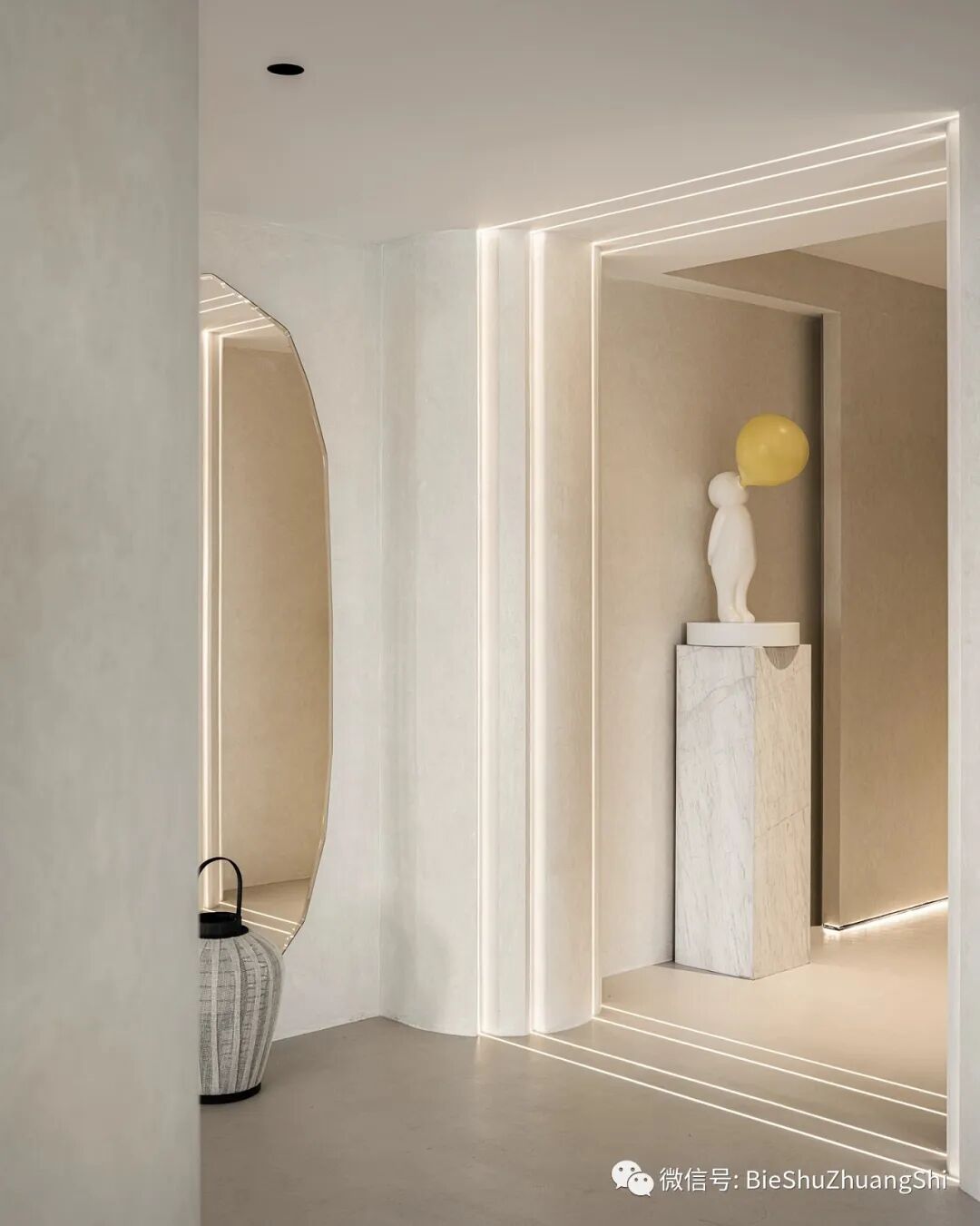 进门入户,设计在线与面两个方向进行了简化处理,没有过多造型的介入,而是在利落和舒畅的注脚下功夫,同时用清浅的色彩减弱它们的存在感,达到既是物体,亦非物体的梦幻感受。