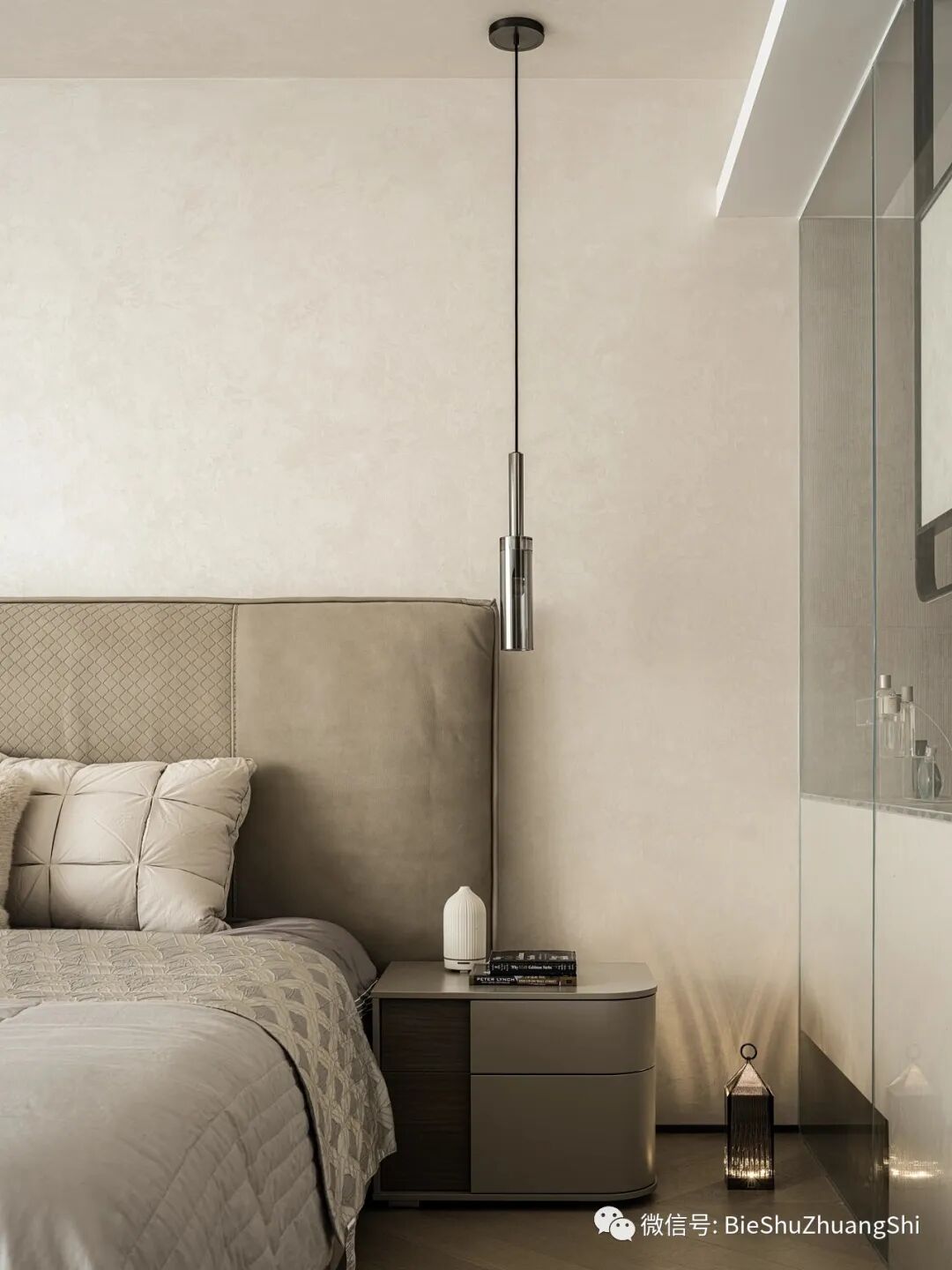 在远近虚实之间,共和出静谧的诗意;设计都回到最极致的简练,在这里任何多余的设计都是不被允许的,去主灯设计的床头灯灯具,尽可能地营造出温馨、柔和的体验感。