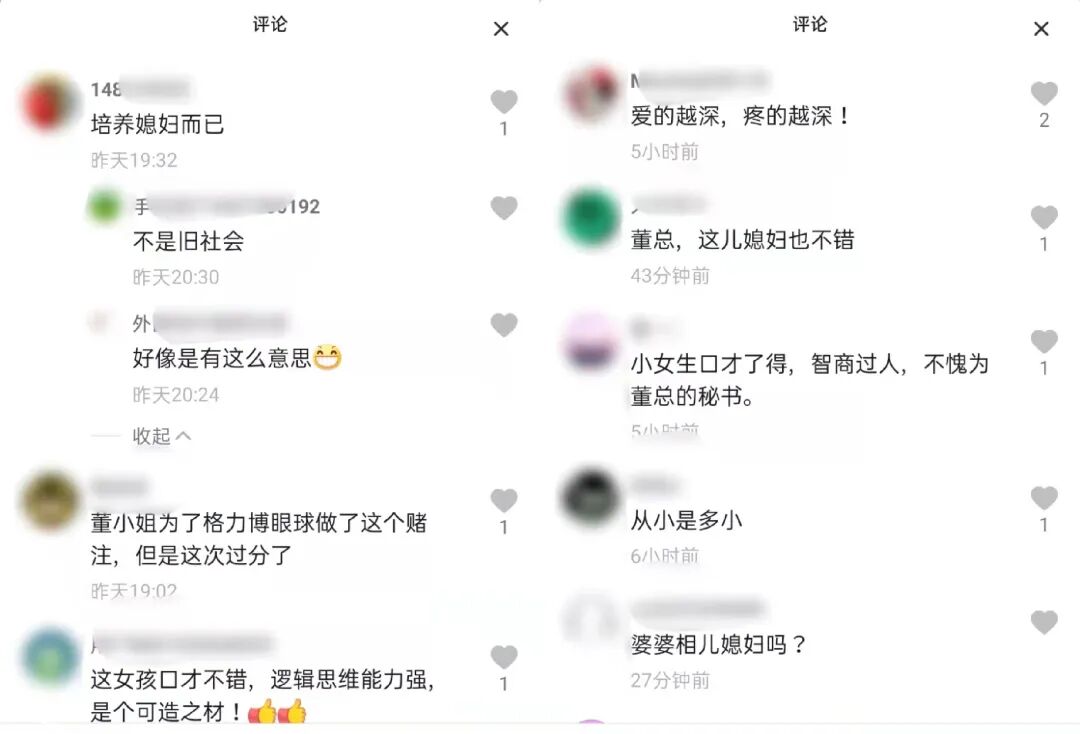 另一些人呢,看到这样一个“年轻漂亮的乖女娃”,替董明珠操心起来儿子的婚姻幸福。在各个媒体发布这条新闻的微博、抖音评论区,都不难看到“董明珠这是在给自己选儿媳”的说法。
