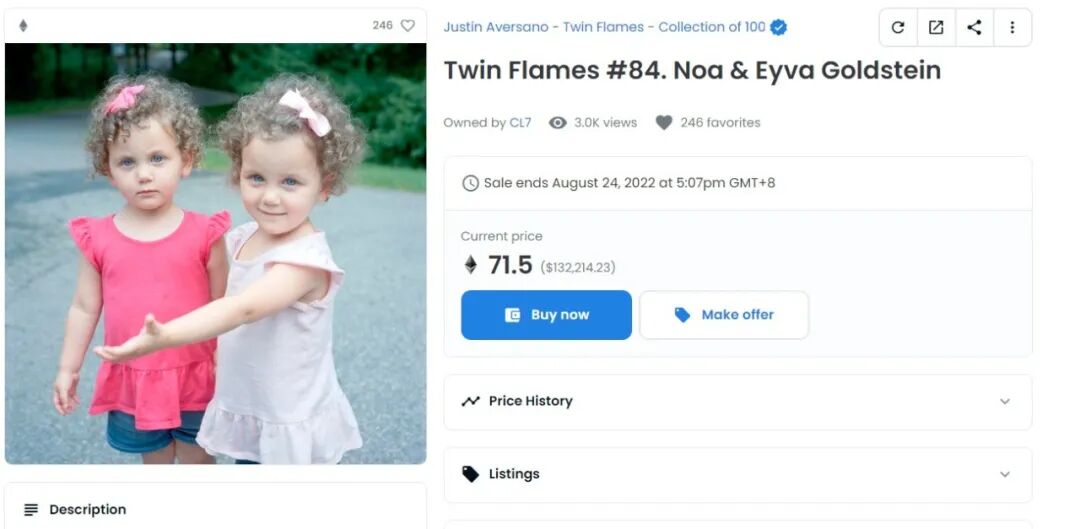 比如这副双胞胎照片,目前的价格是71.5 ETH(约合人民币88万)。