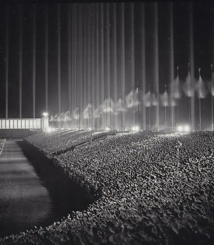 由 Albert Speer 设计的“大教堂”实际上由 152 个防空探照灯组成,间隔 12 米,指向天空,形成一系列围绕观众的垂直条。1937 年。
