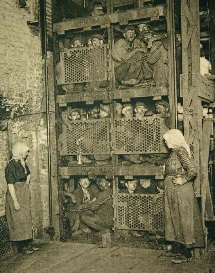 大约 1900 年,比利时的煤矿工人在工作一天后挤进煤矿电梯