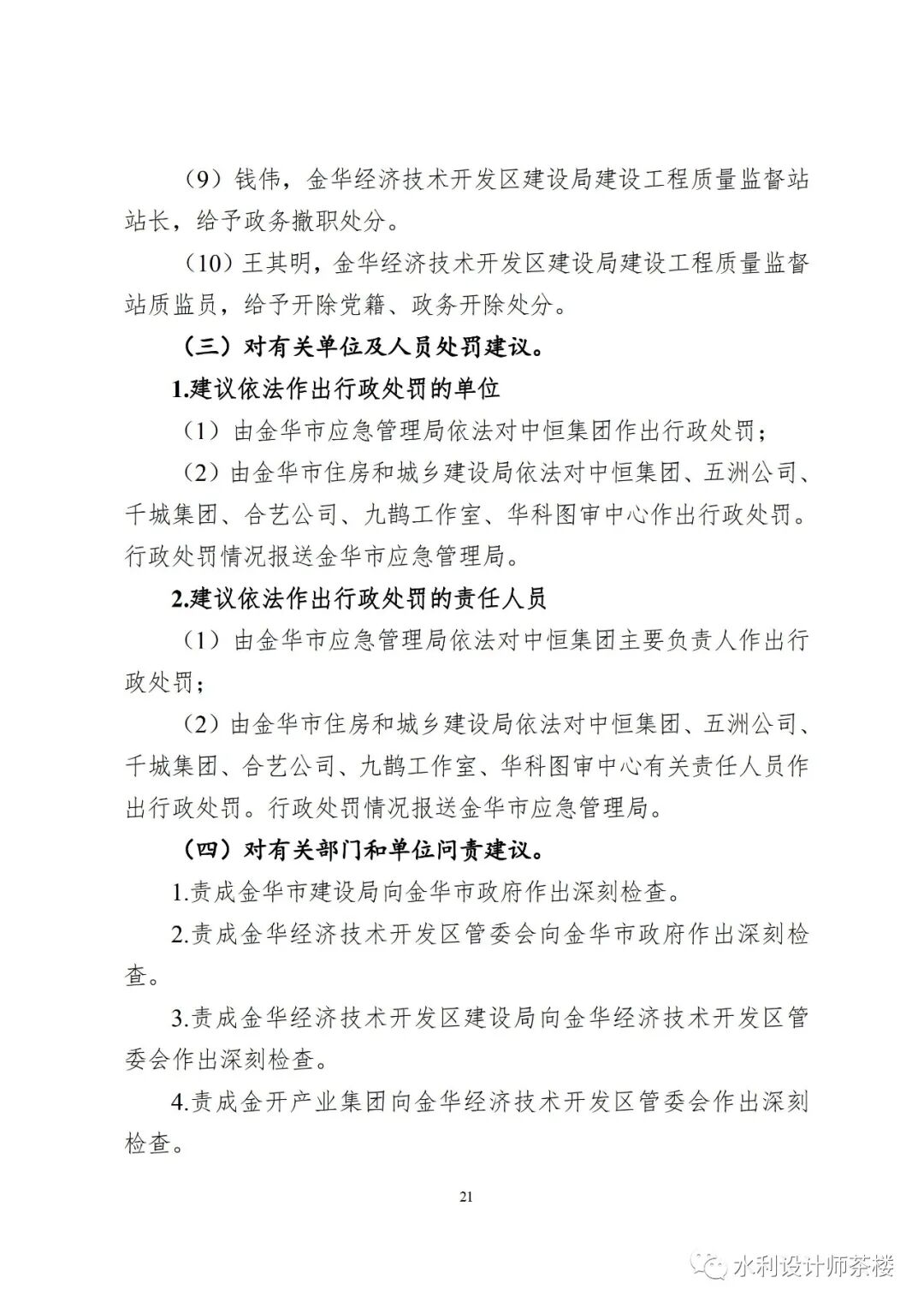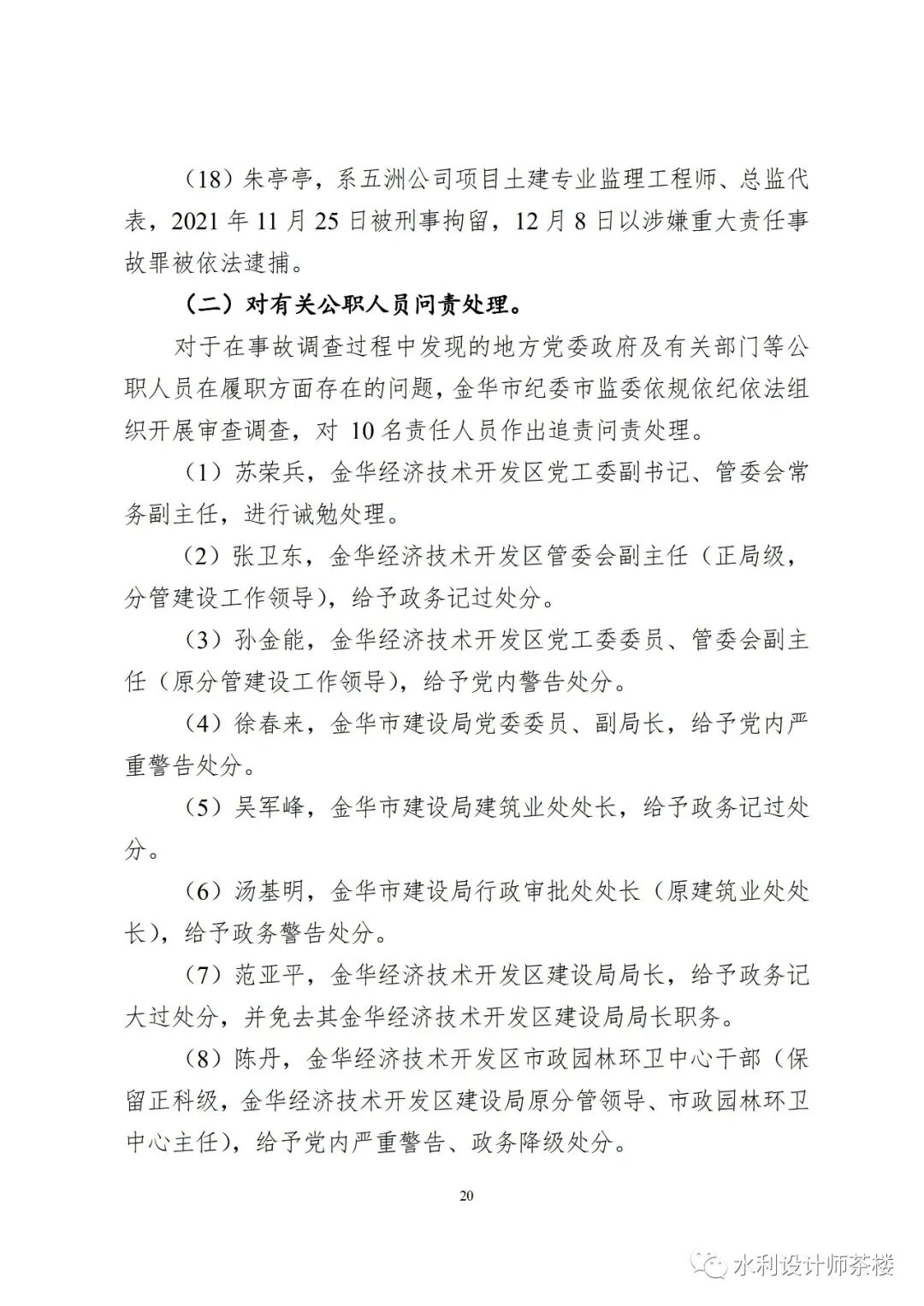 对于在事故调查过程中发现的地方党委政府及有关部门等公职人员在履职方面存在的问题,金华市纪委市监委依规依纪依法组织开展审查调查,对 10名责任人员作出追责问责处理。