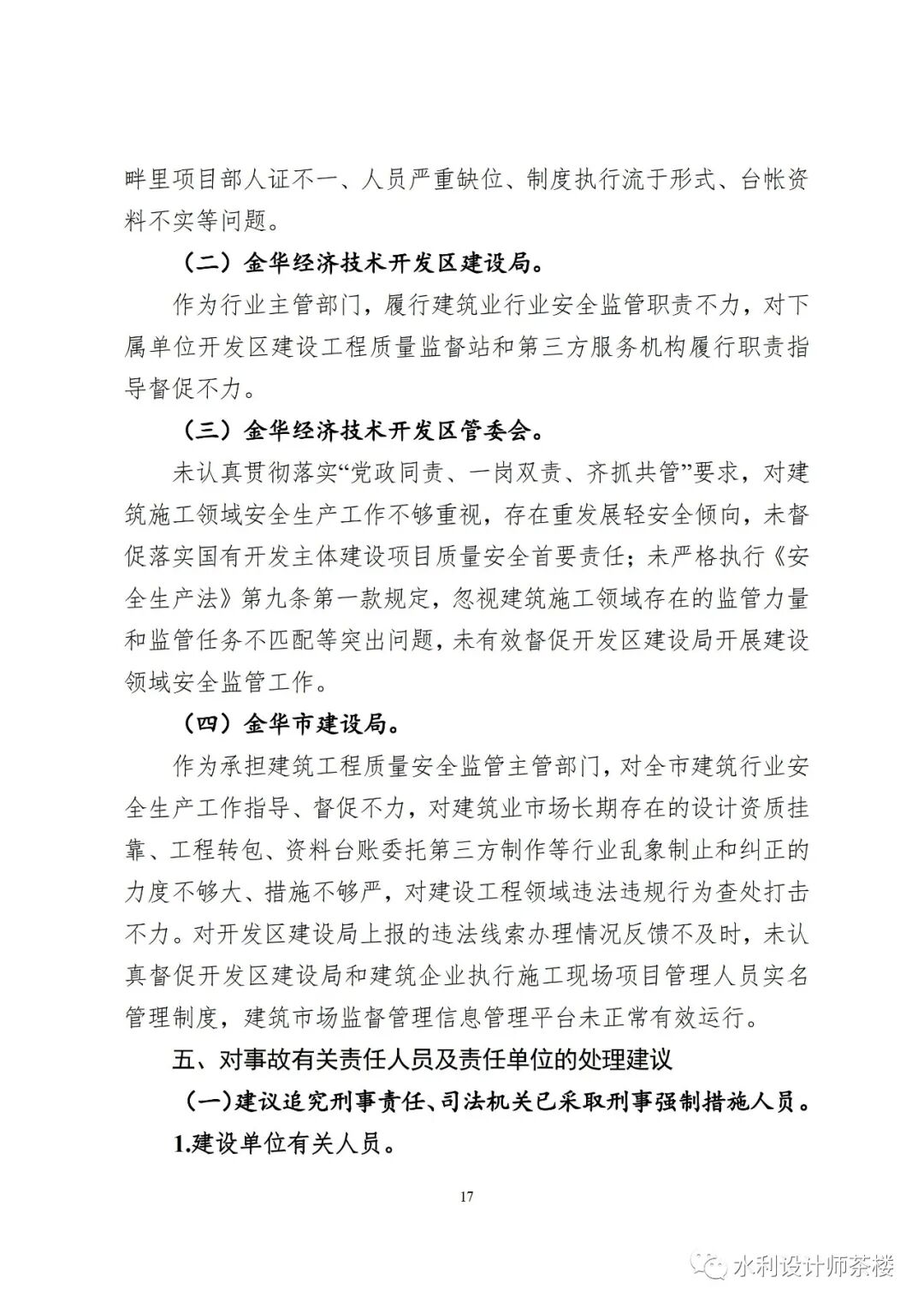 (17) 戴小剑,系五洲公司项目总监理工程师,2021年11月24日被刑事拘留,12 月8日以涉嫌重大责任事故罪被依法逮捕。