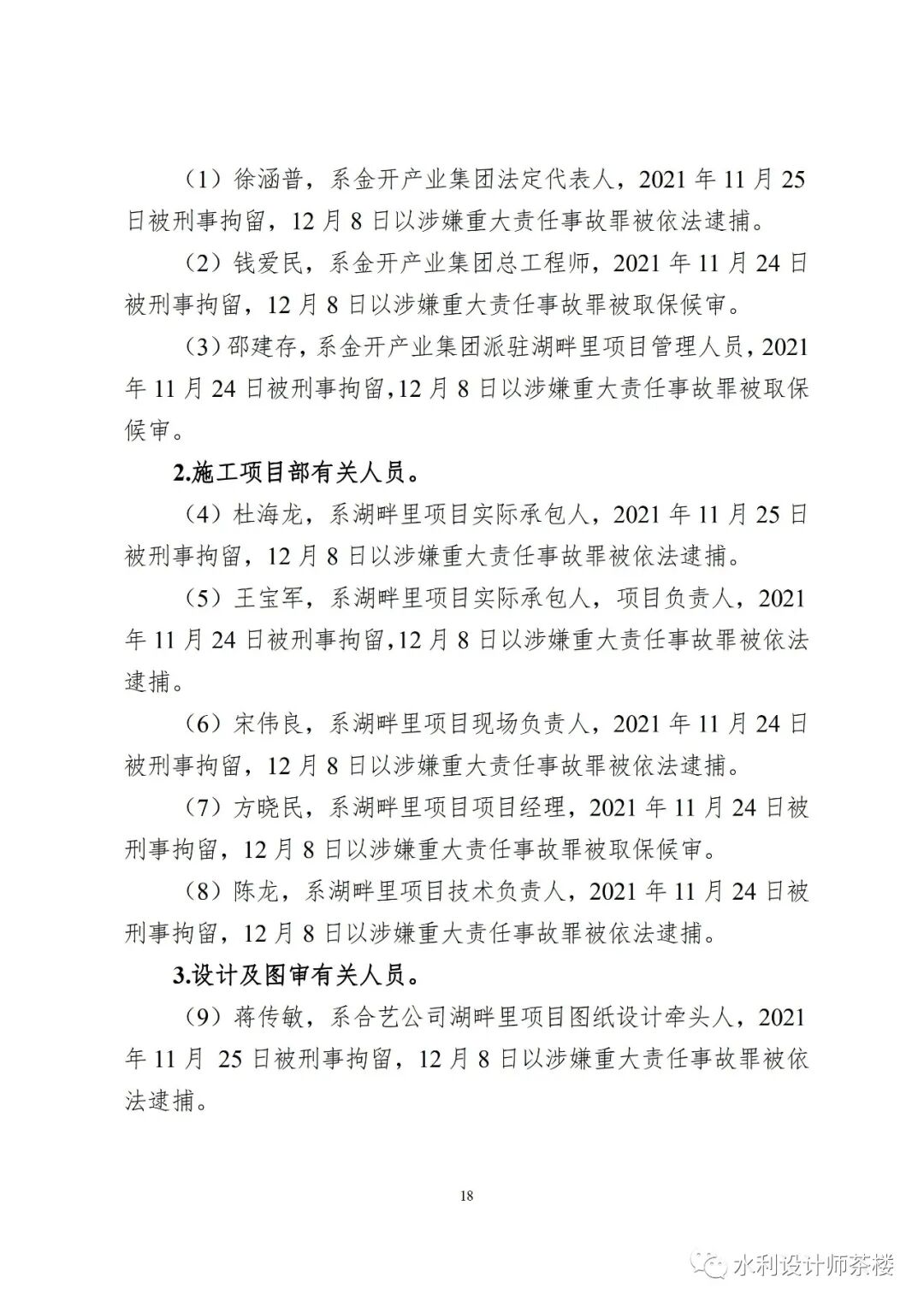 (11)张玮,系湖畔里项目主体结构施工图设计人,2021年11月25日被刑事拘留,12月8日以涉嫌重大责任事故罪被依法逮捕。