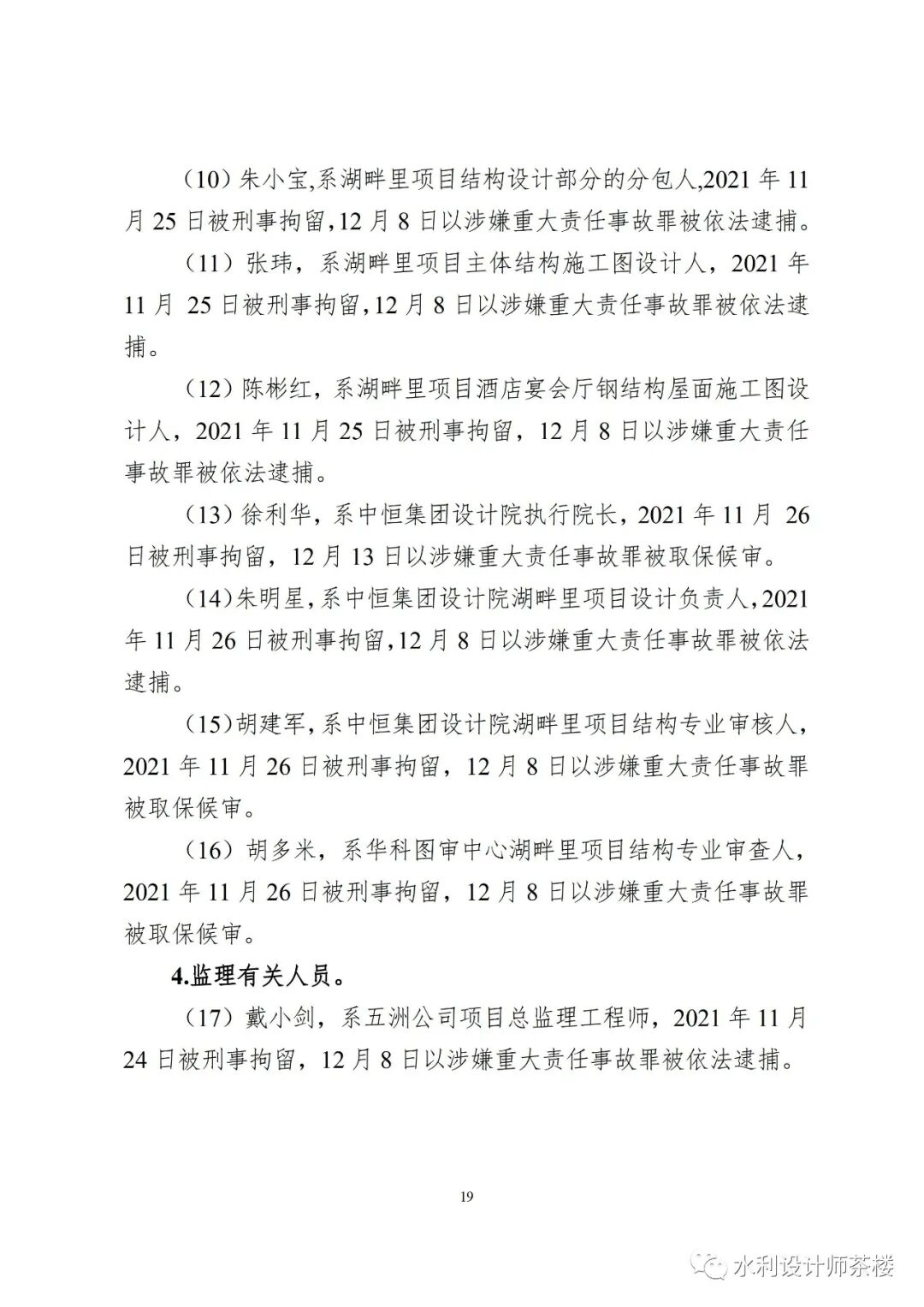 (15)胡建军,系中恒集团设计院湖畔里项目结构专业审核人,2021年11月26日被刑事拘留,12 月8日以涉嫌重大责任事故罪被取保候审。