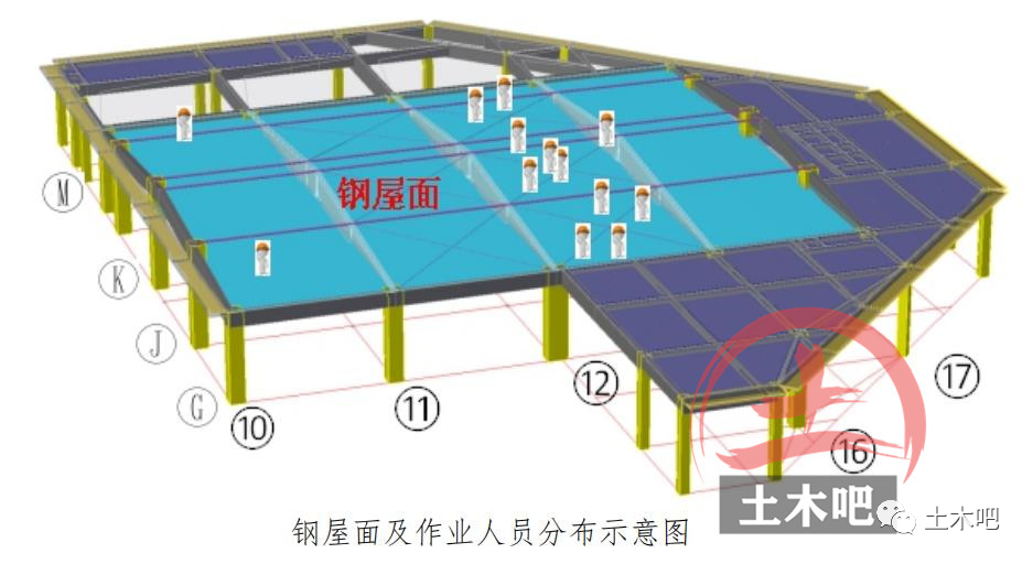 屋面钢结构设计存在重大错误,结构设计计算荷载取值与建筑构造做法不一致,钢梁按排架设计,未与混凝土结构进行整体计算分析;未按经施工图审查的设计图纸施工,将钢结构屋面构造中20mm厚水泥砂浆找平层改为50mm厚细石混凝土,且浇筑细石混凝土超厚,进一步增加了屋面荷载。因上述原因造成钢梁跨中拼接点高强螺栓滑丝、钢梁铰接支座锚栓剪切和拉弯破坏,导致11、12轴二榀屋面钢梁坍塌。