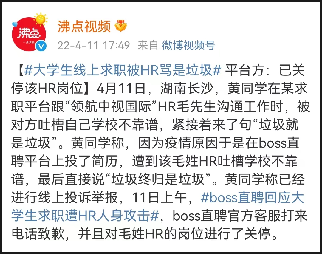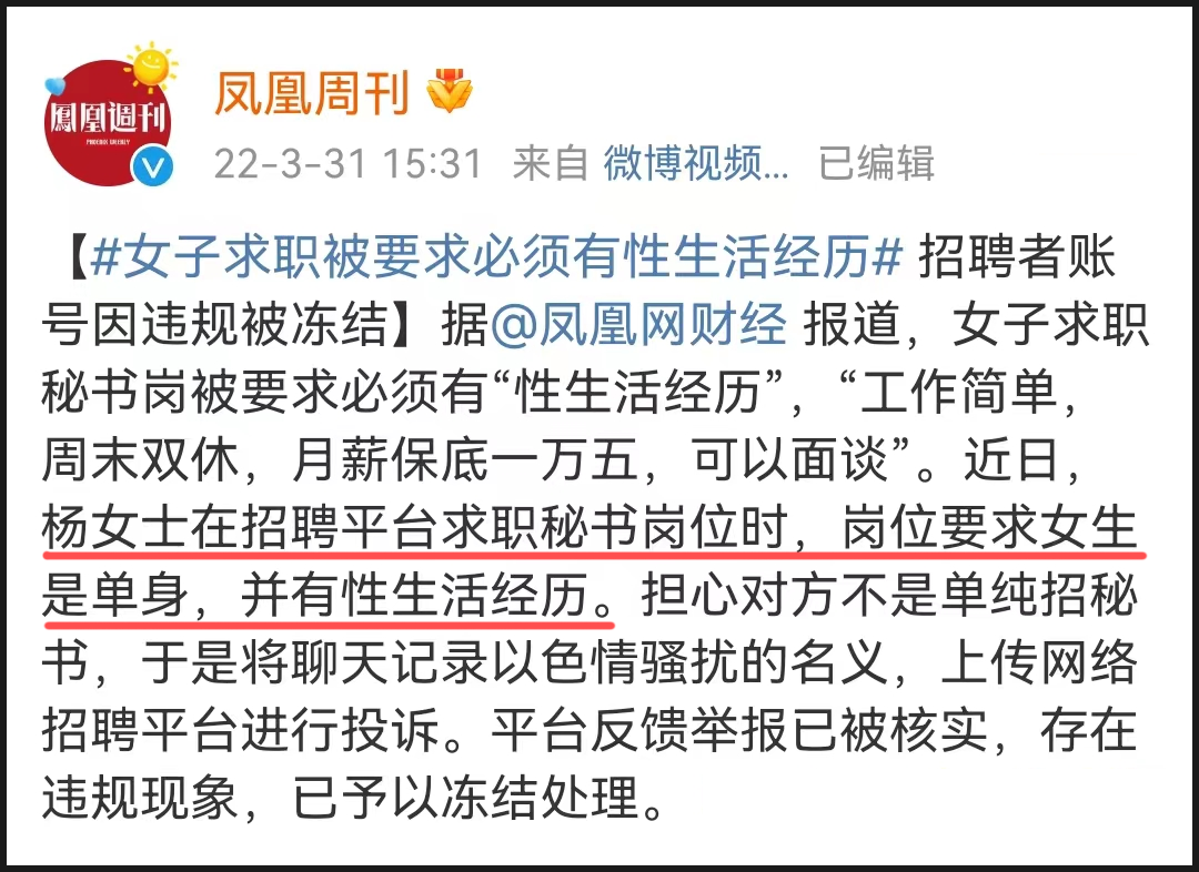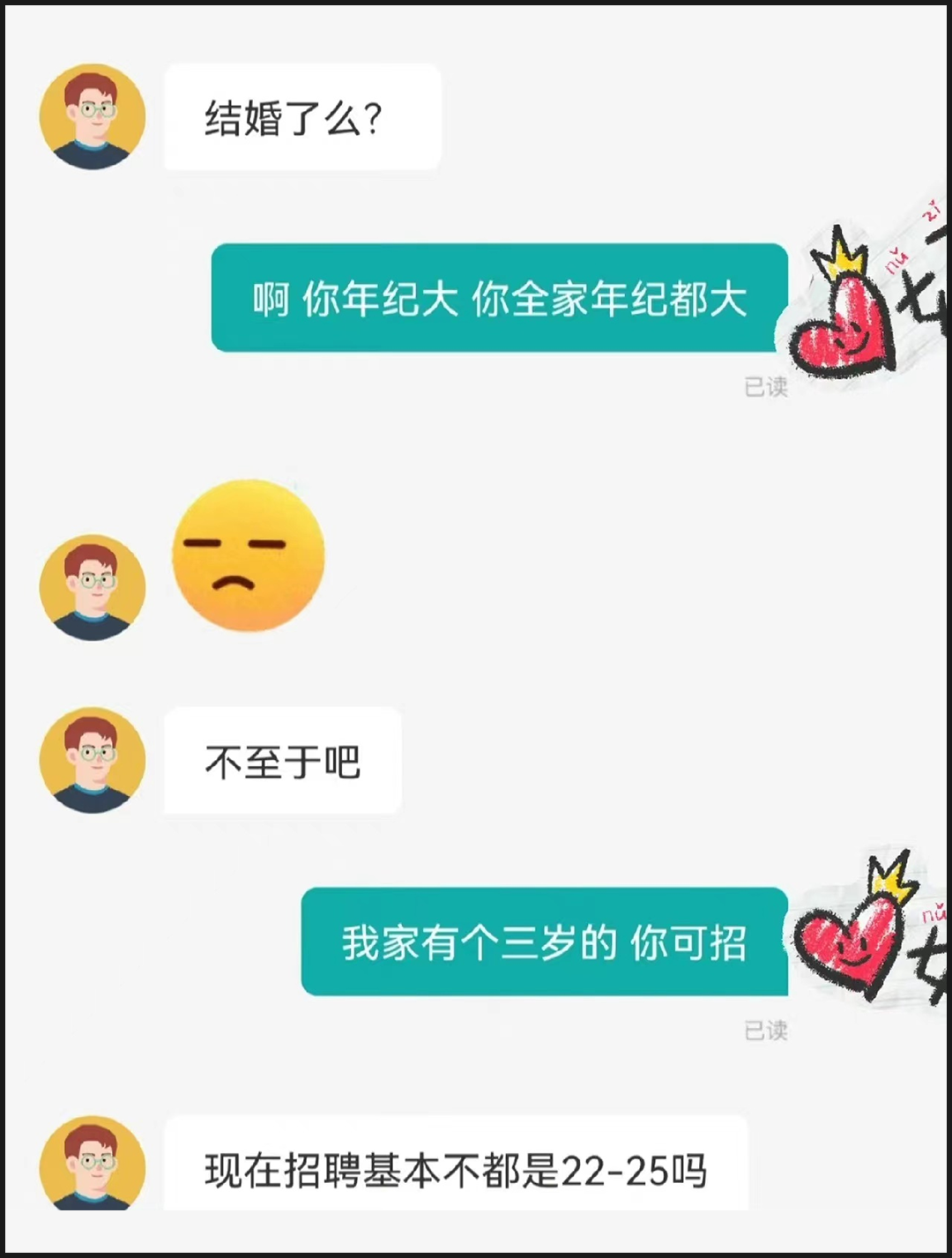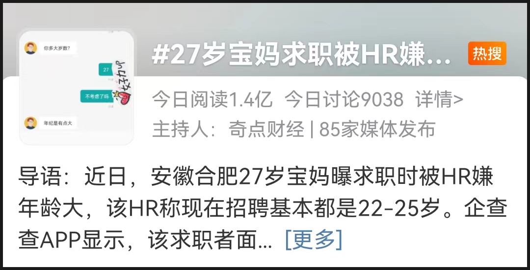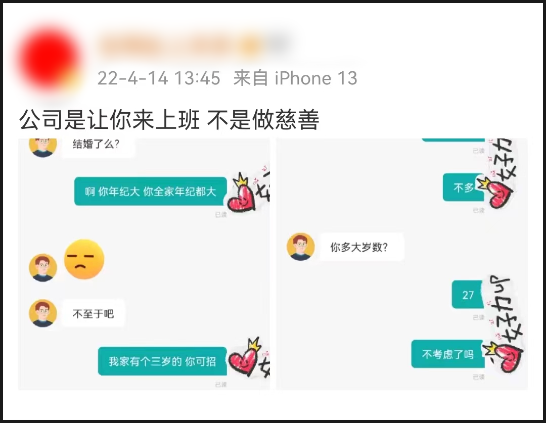 最新文章2023-09-11 27岁,被HR嫌弃年龄大? 果然是每年的求职旺季,都会暴露很多关于求职的问题和矛盾。前有长沙公司HR嘲讽求职者,喜欢双休的没事业心。 现又有求职者爆料,安慰合肥一公司HR,嫌弃27岁宝妈求职者年龄大,同时也登上了微博热搜,引发广大网友们的热议。 下面看看具体的聊天内容: 随即该HR称:“现在招聘基本不都是22-25吗” 按照这个标准,大学专科、本科毕业还有可能工作两年,如果是研究生或更高学历毕业,那岂不是毕业即退休。 我以为是工资特别高、福利待遇很好的岗位,不然怎么会敢要求那么苛刻?结果仔细一看,该公司招聘的岗位是文员,薪资范围3000-4000元。 3-4K的岗位要求都这么高了,这要是7-8K甚至更高的,还不得起飞了? 再来看看网友们的锐评: 而后有网友爆料,疑似与该公司有关联微博账号发言:“公司是让你来上班,不是做慈善” 好家伙!27岁找工作公司不做慈善都找不到了?看来像我这种93年的大叔,是应该享受老年退休生活了~ 这里科普一下:我国《就业促进法》规定,劳动者依法享有平等就业和自主择业的权利。非硬性和必要的年龄歧视,侵害了打工人的平等就业权。 但即便如此,职场大环境对于女性依然不友好。 据《2021中国女性职场现状调查报告》显示,有近6成的女性在求职过程中被问及婚姻生育状况,而同一问题仅有2成男性会被问到。 其实从这段时间大家跟我的私信聊天中也能感受到,提及年龄问题的80%都是女生。 未婚的女生公司怕结婚;结婚后的怕生育;生育后的怕兼顾家庭,不能全精力投入到工作中;刚毕业的又被嫌弃没有工作经验…… 所以在今年全国两会期间,人大代表李亚兰曾提出#建议制定女职工就业性别歧视标准# 老张也真心的希望职场早日消除性别、年龄、学历等各种歧视问题,让我们的就业环境变得越来越好。 另外,关于职场中的奇葩、迷惑行为还有很多,比如某公司招聘女秘书岗位,要求有女生是单身,但需有性生活经历? 离了弥天之大普!这怕不是在招聘秘书吧? 建议求职者直接报警~ 另外最近有一位大学生求职时,被某公司HR吐槽自己母校不靠谱。好家伙,直接针对一个大学? 更让人没想到的是,最后该公司HR还来了句:“垃圾终归是垃圾” 能说出这番言论的人,我愿称之为货真价实的辣鸡! 最终当事人也通过招聘网站,对此公司进行了举报,平台则关闭了毛姓HR的岗位招聘。 要说前面几个属于离谱,那么接下这位设计师的求职遭遇,就有点迷惑了,只因询问“现在部门有几个美工在职”,就被HR阴阳怪气。 “你有没有面试机会是我说了算”、“能力再好我说你不合适就不合适”,优越感爆棚啊! 真当自己在职场中有“生杀予夺”的权利了? 还有更迷惑的,面试前不让求职者询问薪资和工作时间的: 让人无语的问题:你一天可以上多少天班? 能接受出差吗? 重庆的这家公司更奇葩:老板信风水,只招一个属羊的 最让人无法理解的:现实生活中有盲盒手办、盲盒零食、盲盒美妆等等,谁能想到,岗位招聘也有盲盒? 真是让人啼笑皆非~ 最后我无意间看到一位网友总结的《2022年人才市场现状》也很有意思,大家一起来看看: 对于职场中的这些行为,你怎么看? 推荐阅读 动手标星,精彩文章不错过 本文来自微信公众号“美工美邦”(ID:laozhang-sj)。大作社经授权转载,该文观点仅代表作者本人,大作社平台仅提供信息存储空间服务。 TAGS: HR中公司招聘职场 相关文章英赫日报 | 李宁 × 空…米兰时装周的异星来客,用结…米兰“MoLo”移动与物流…西班牙艺术家 Juan d…把小鸟画成美少女,她弃医从…这些鸡蛋包装不只是有趣,设…国产文具又炸了!晨光再造“…七点资讯 |《更衣人偶坠入…AlphaDraw筑绘通「…秦始皇的黑,是你不懂的黑。