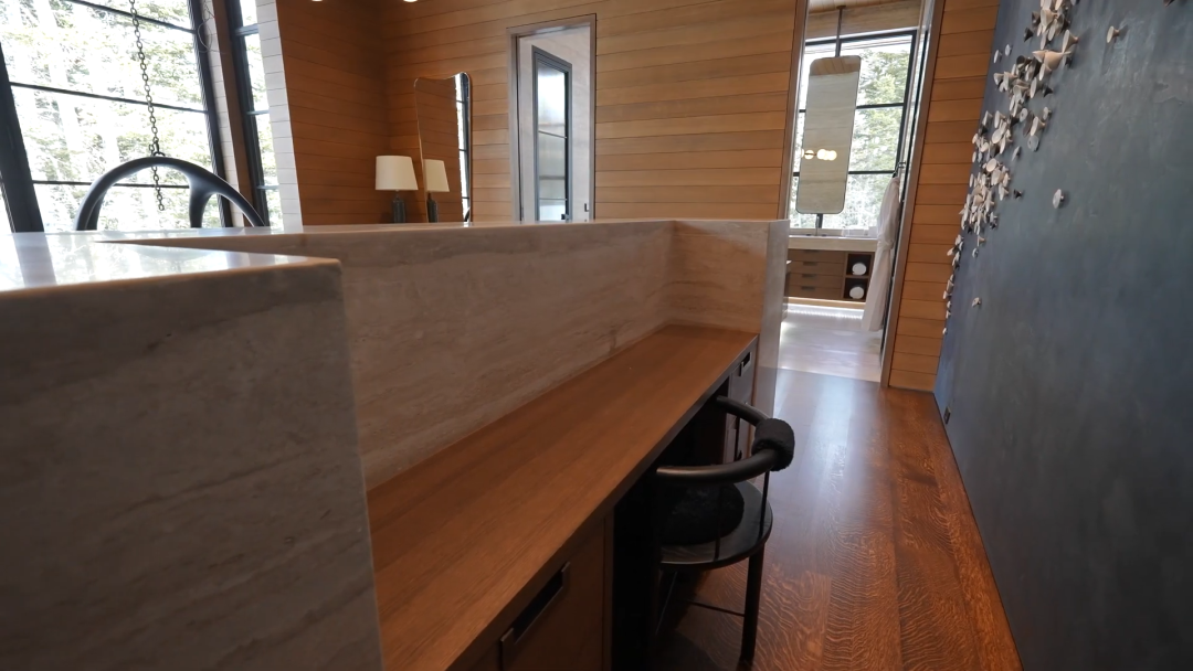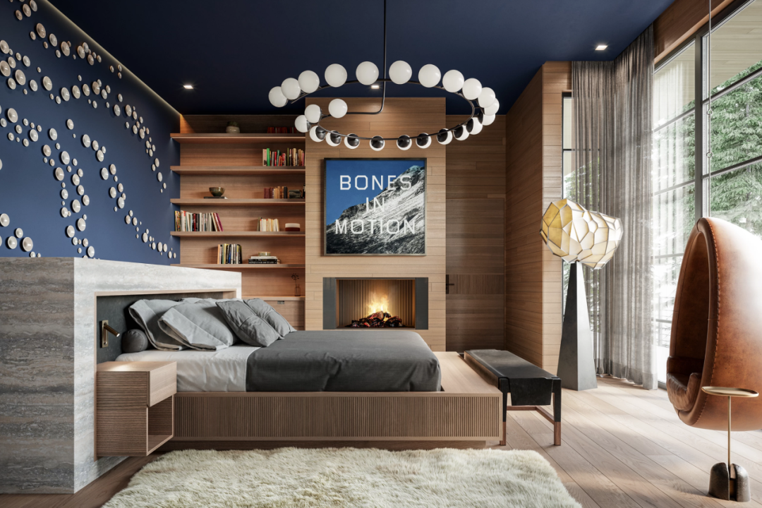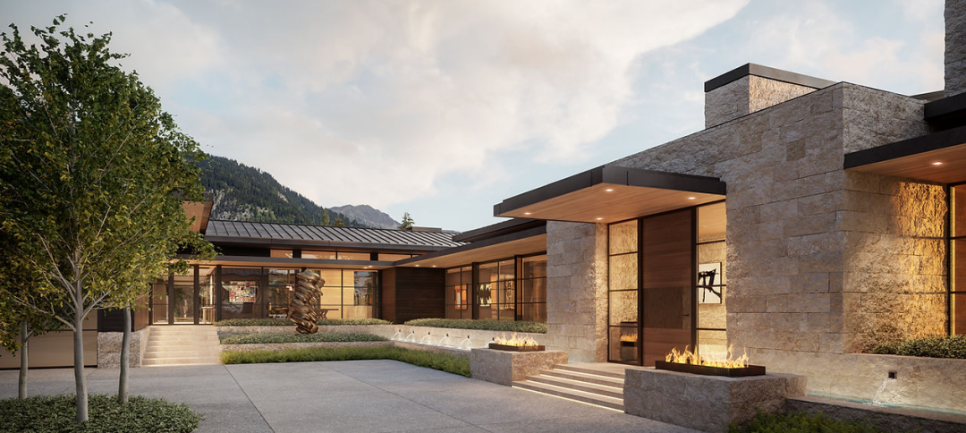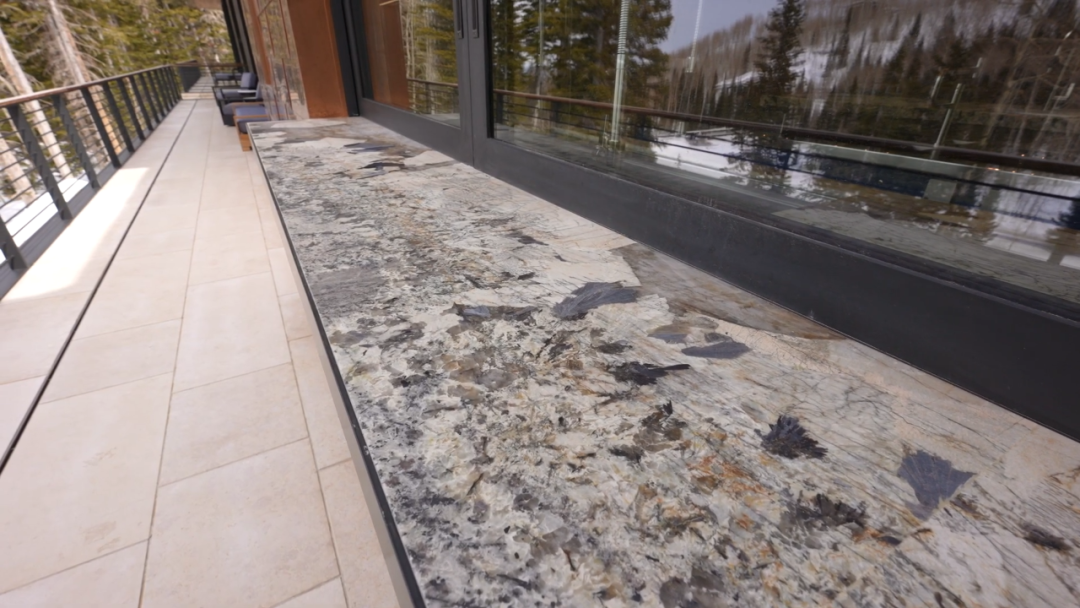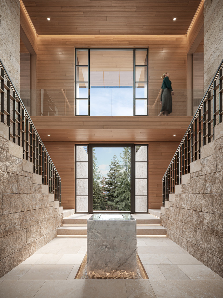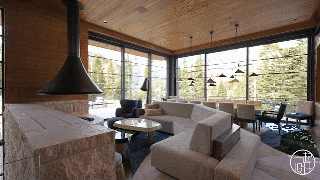 另一侧的室外空间拥有环绕式阳台,户外用餐区,烧烤区,在这可以欣赏到周围的树木、山脉、滑雪场等景色。