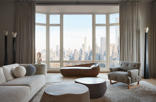 从起居室的窗户可以欣赏到中央公园和城市的壮丽景色,曲线与直线、光滑与磨砂的对比,让人在淡雅的中性色调中也能感受到活力。