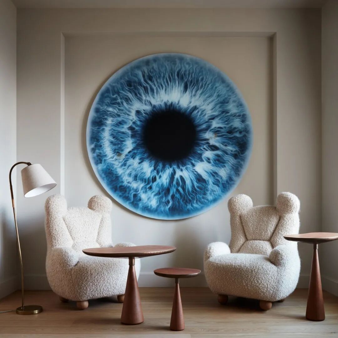起居室的墙上也出现了英国艺术家 Marc Quinn 的虹膜作品。门框被黑色线条包围,形成对比。