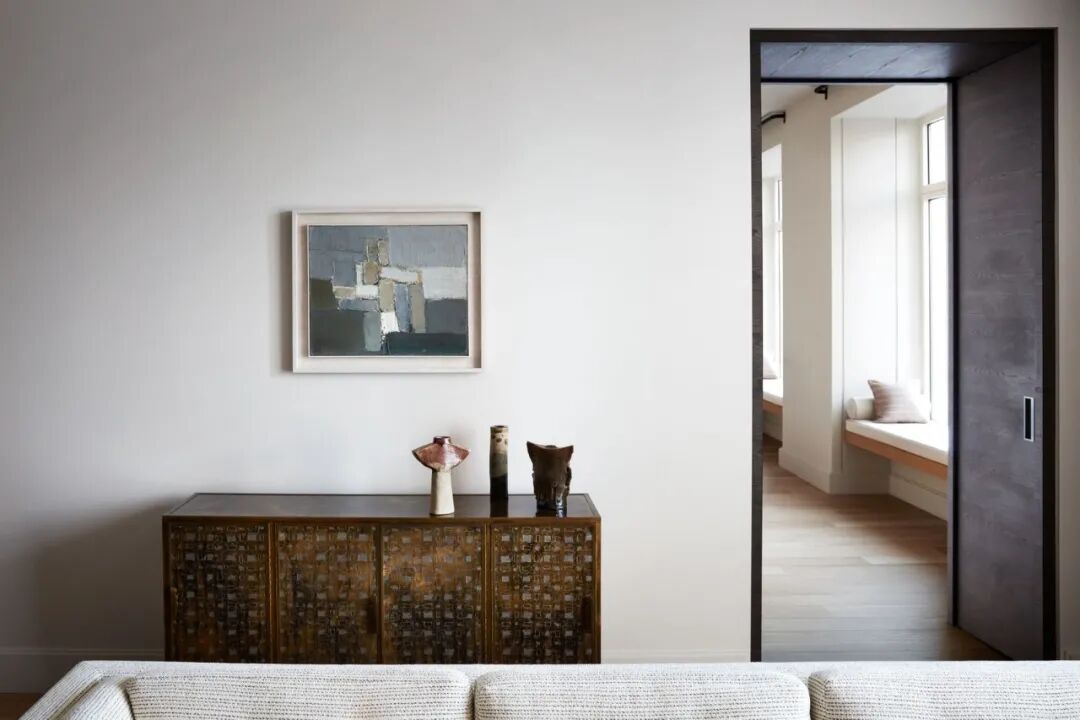 在沙发后方摆放着古董金属柜以及陶瓷作品,增强了空间的层次。