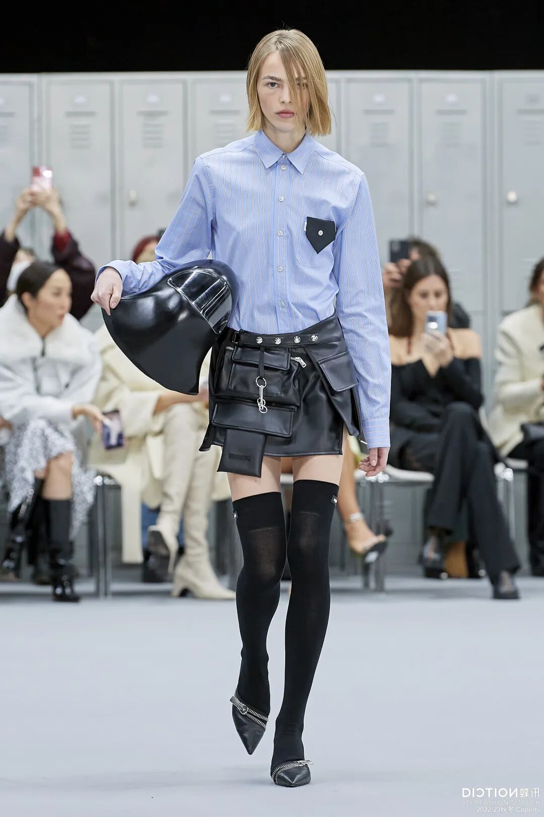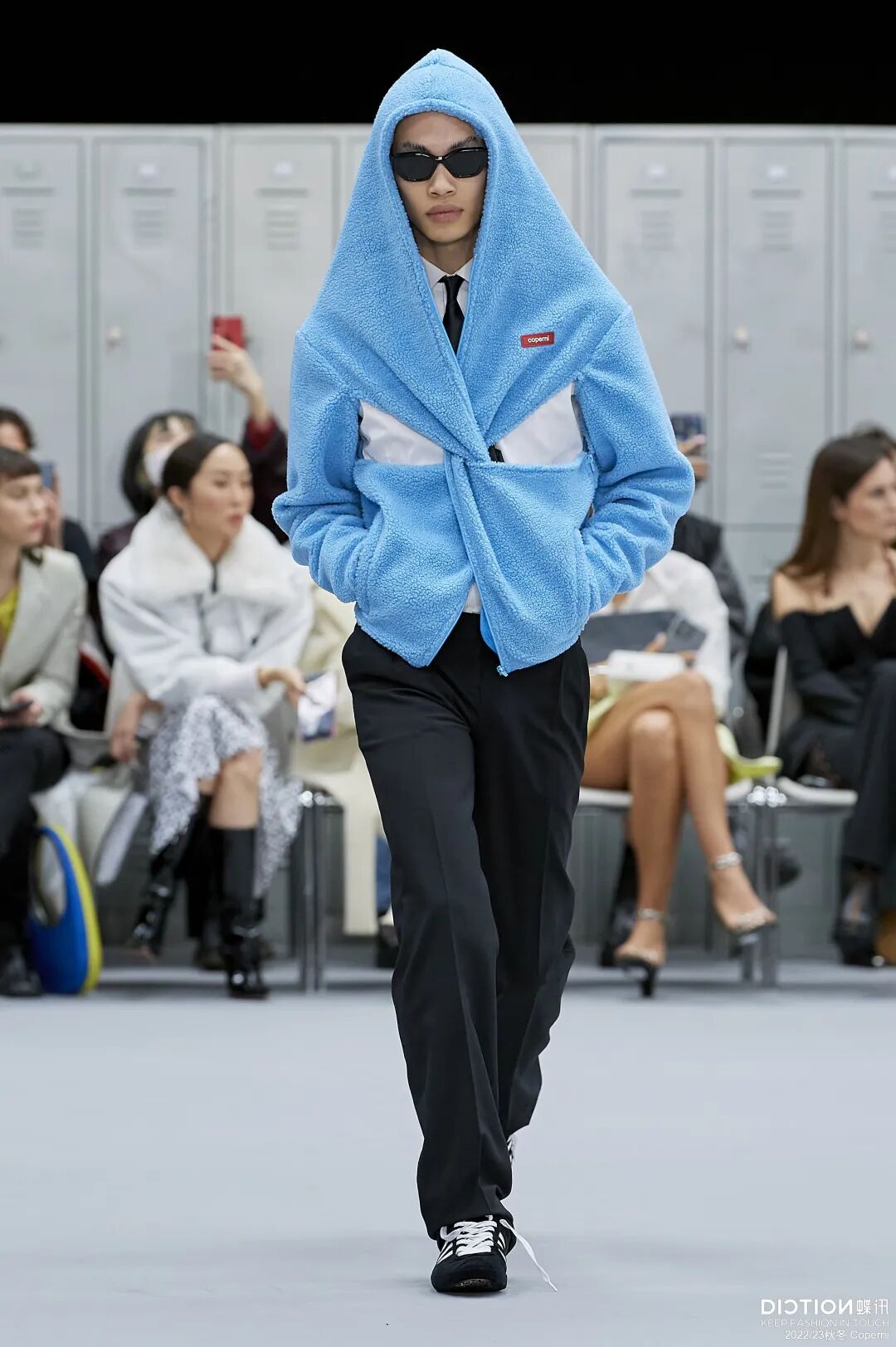 Coperni 2022秋冬系列命名为「Coming of Age」对青春的歌颂,灵感来自于高中生涯。当走入巴黎郊区的白色巨大电影棚内,喇叭忽然响起:「阳光照耀着 Coperni 高中校园」,两旁尽是校园内熟悉的灰色金属储物柜走廊,几乎是每个学生自我展示的天桥。