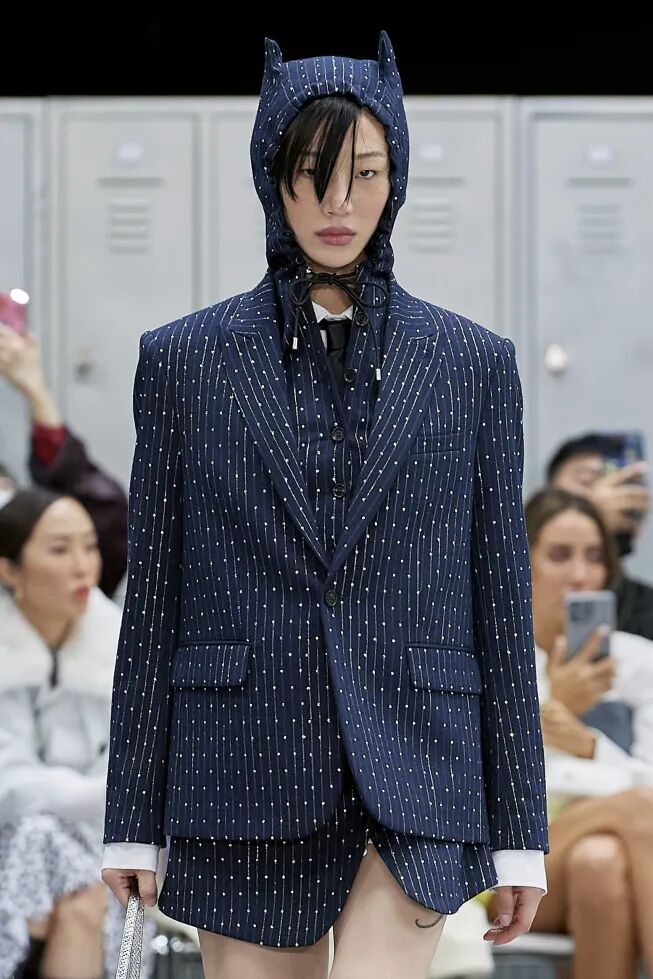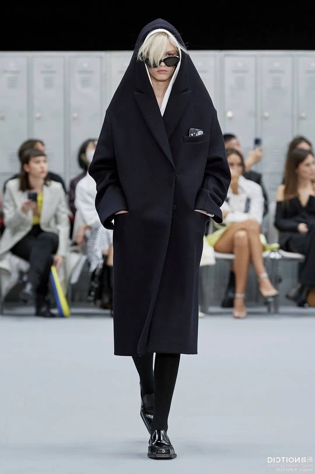 从《The Virgin Suicides》到《Cruel Intentions》,经典的青少年电影启发了Coperni 的造型设计,当中最让人印象深刻便是运动连帽。量身定做的大衣翻领延伸到了头上、以及 Balaclava 头套形成茧状的效果,仿佛暗喻出「没有安全感青春期的蛹被锻造成了有自我意识的年轻蝴蝶。」