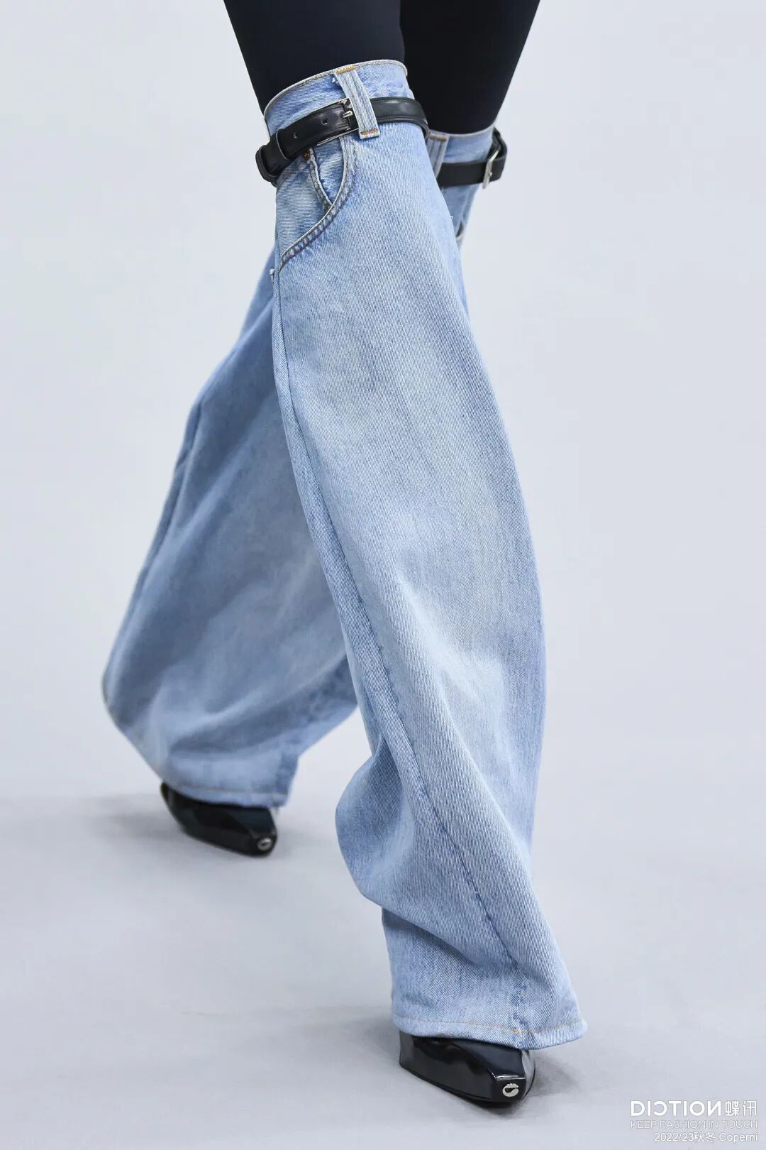 而牛仔裤和皮裤被裁剪成及膝的护膝,某种程度上是对低腰所带来的叛逆的一种有趣的翻版。