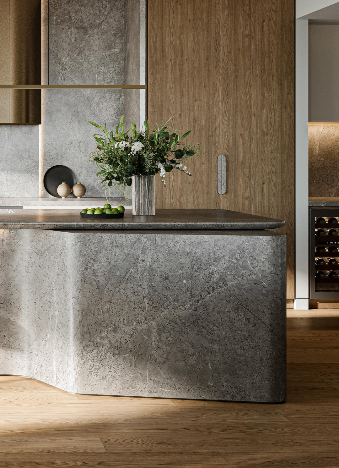 厨房同样选用一系列曲线型家具,木饰面的落地橱柜、金属饰面的油烟机罩,石材饰面的台面与挡板,每一处设计都格调满满。