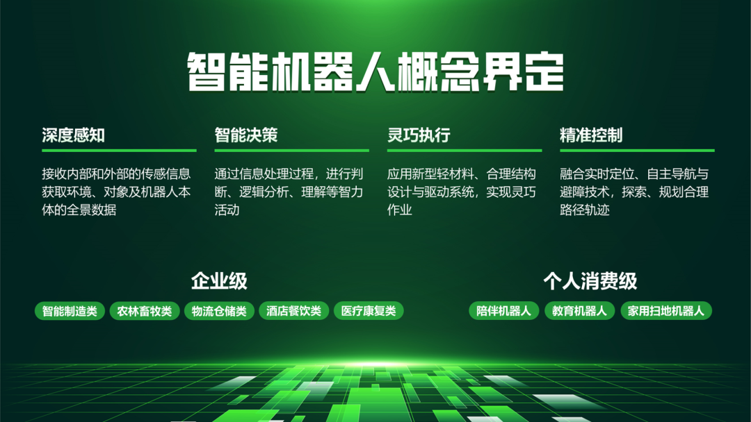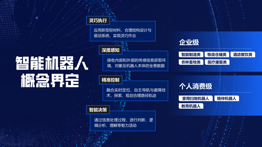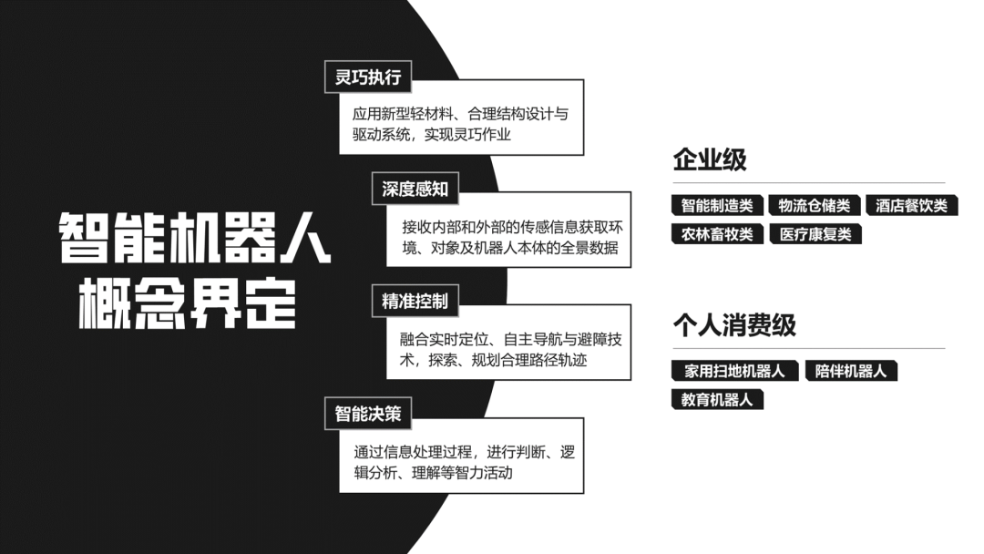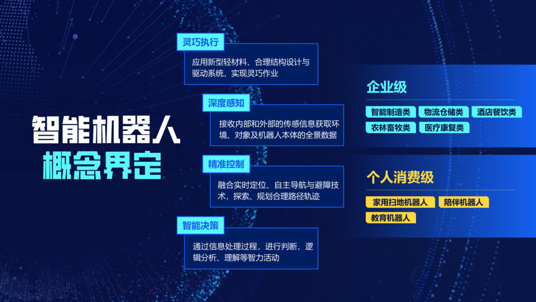 第一大段,讲述智能机器人概念界定的四个要点;下面两段,讲述了「企业级」与「个人消费级」机器人涵盖的种类。