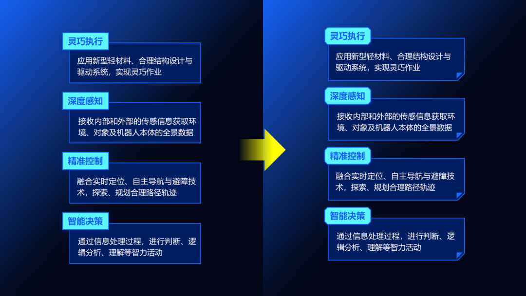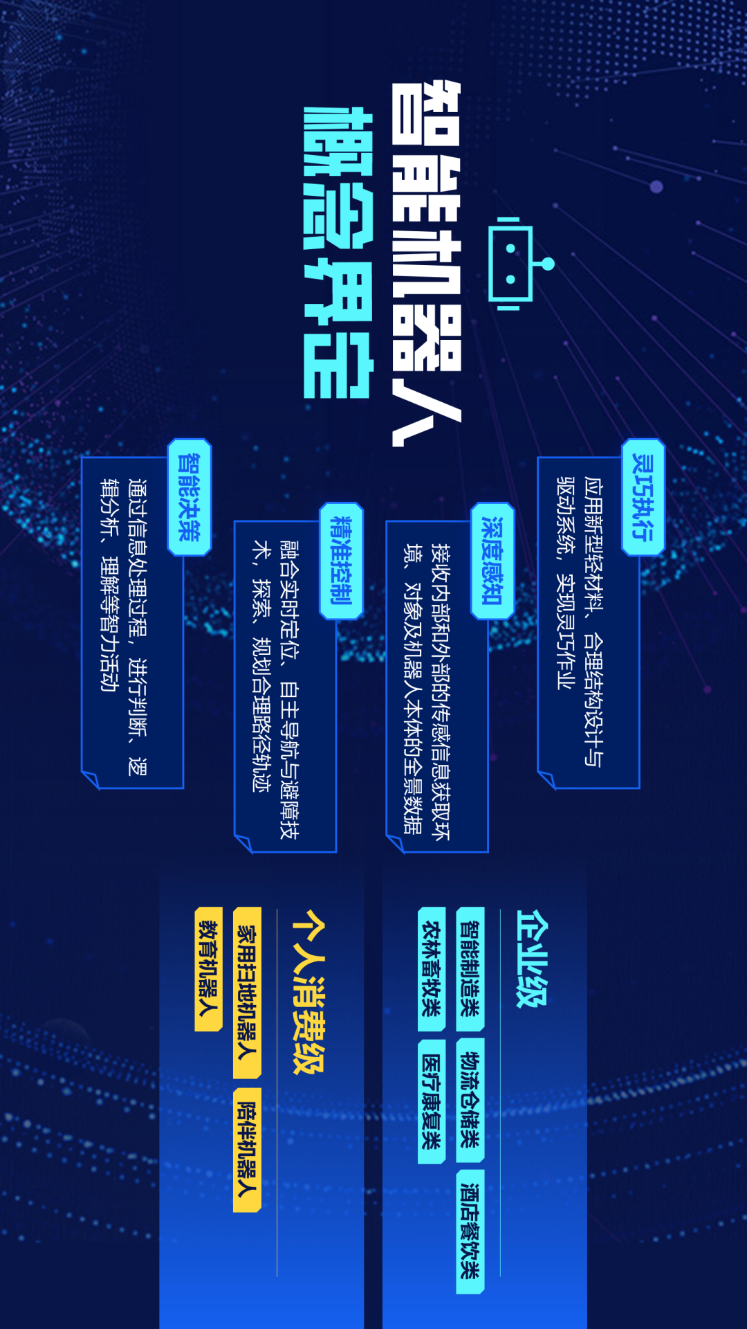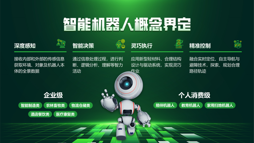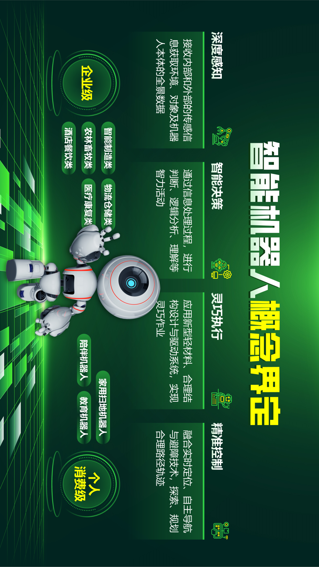 第一大段,讲述智能机器人概念界定的四个要点;下面两段,讲述了「企业级」与「个人消费级」机器人涵盖的种类。