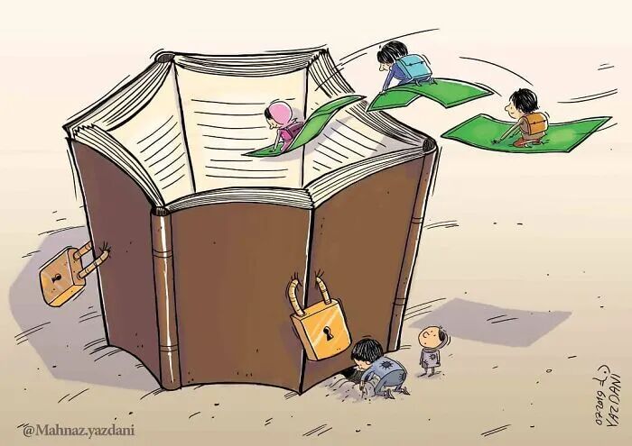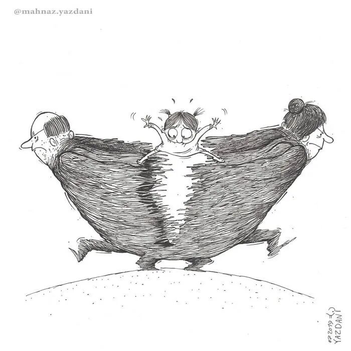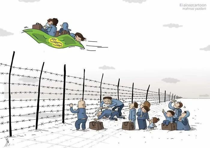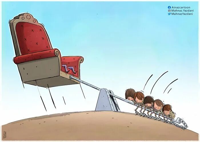 今天,小绛再来为大家介绍一位非常优秀的讽刺性插画家,这位插画家的名字叫做马纳兹·亚兹达尼,他从事讽刺性插画创作多年,作品登上过许多著名杂志,每一幅作品都揭露一个他所看到的社会问题,在这些作品中,有的绘画的场景非常常见,就是我们每一个人每天都会遇到的问题,也有一些场景是特定地区或特定人群才会遇到的问题。