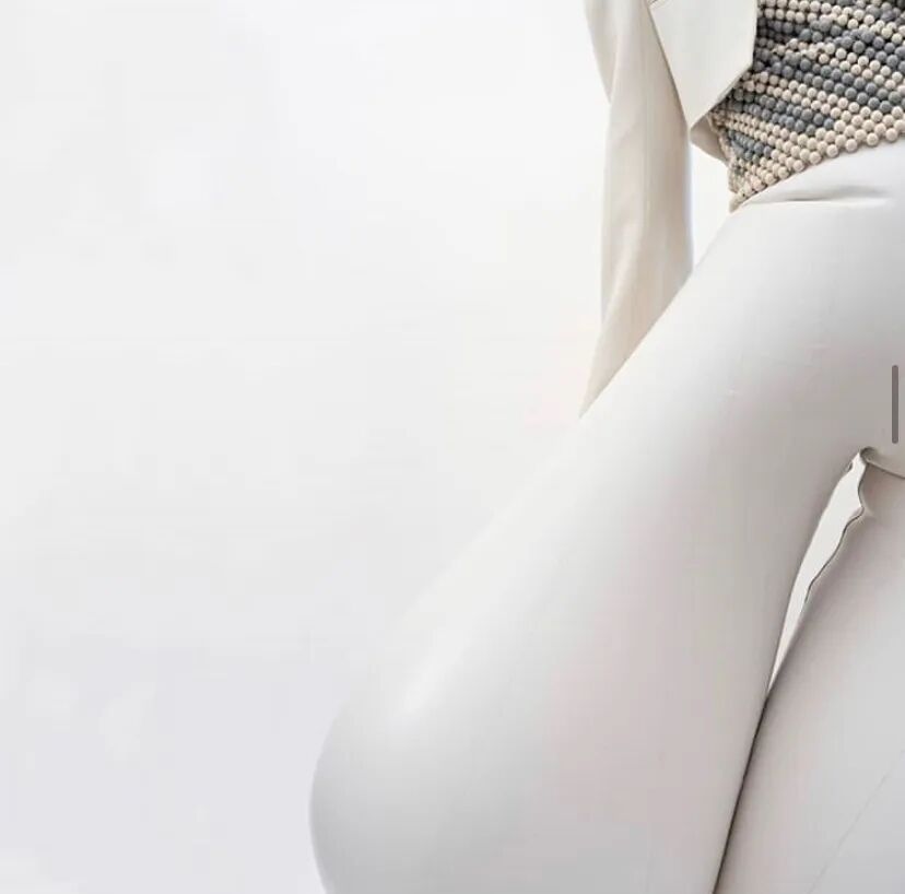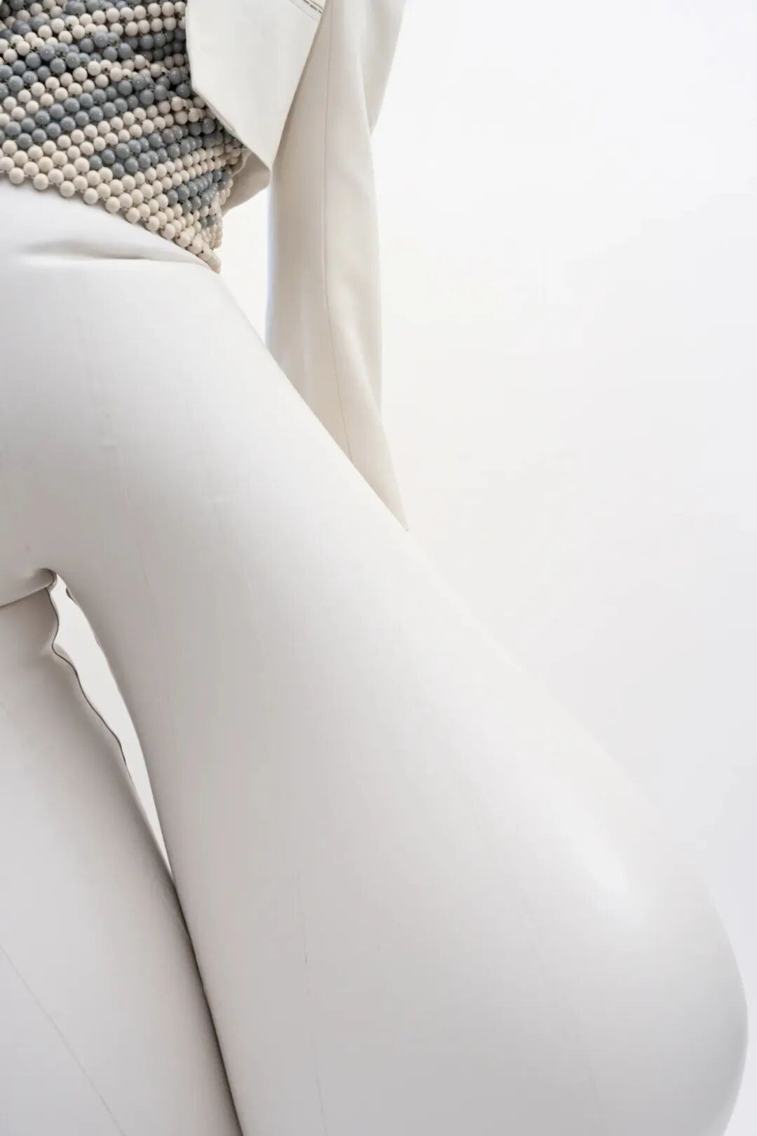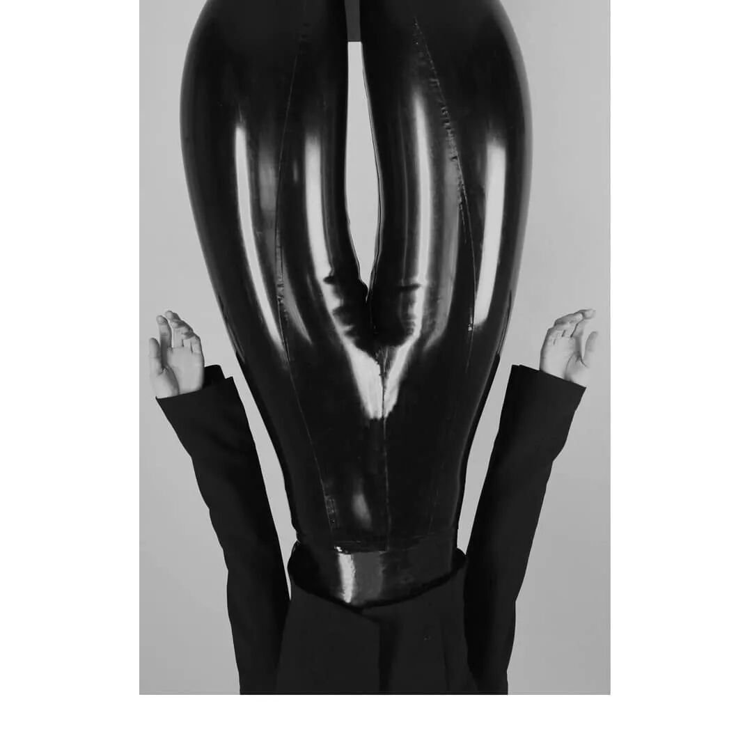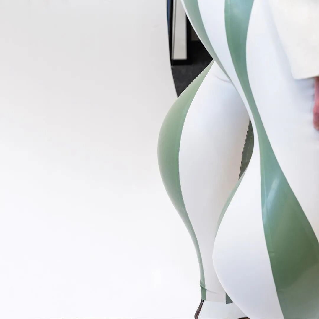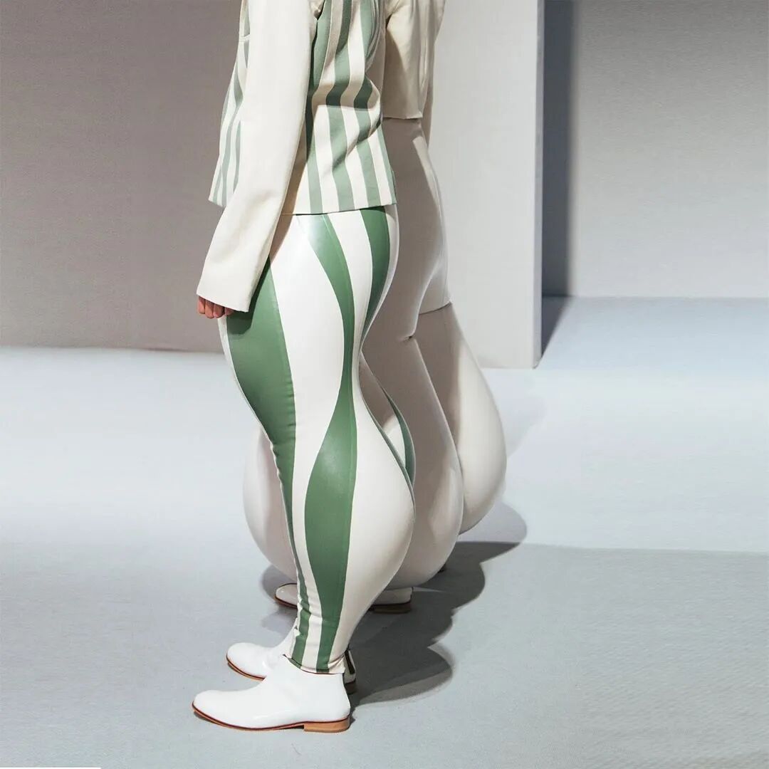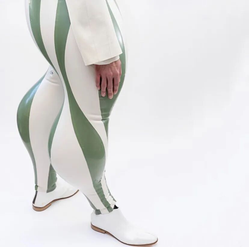 乳胶塑造是扭曲三维感的理想材料,此外Harikrishnan并通过其反光的外表强调了裤子凸出的轮廓使得质感更加精致,将各个乳胶面板排列成垂直或水平的条纹也进一步增加了这种效果。