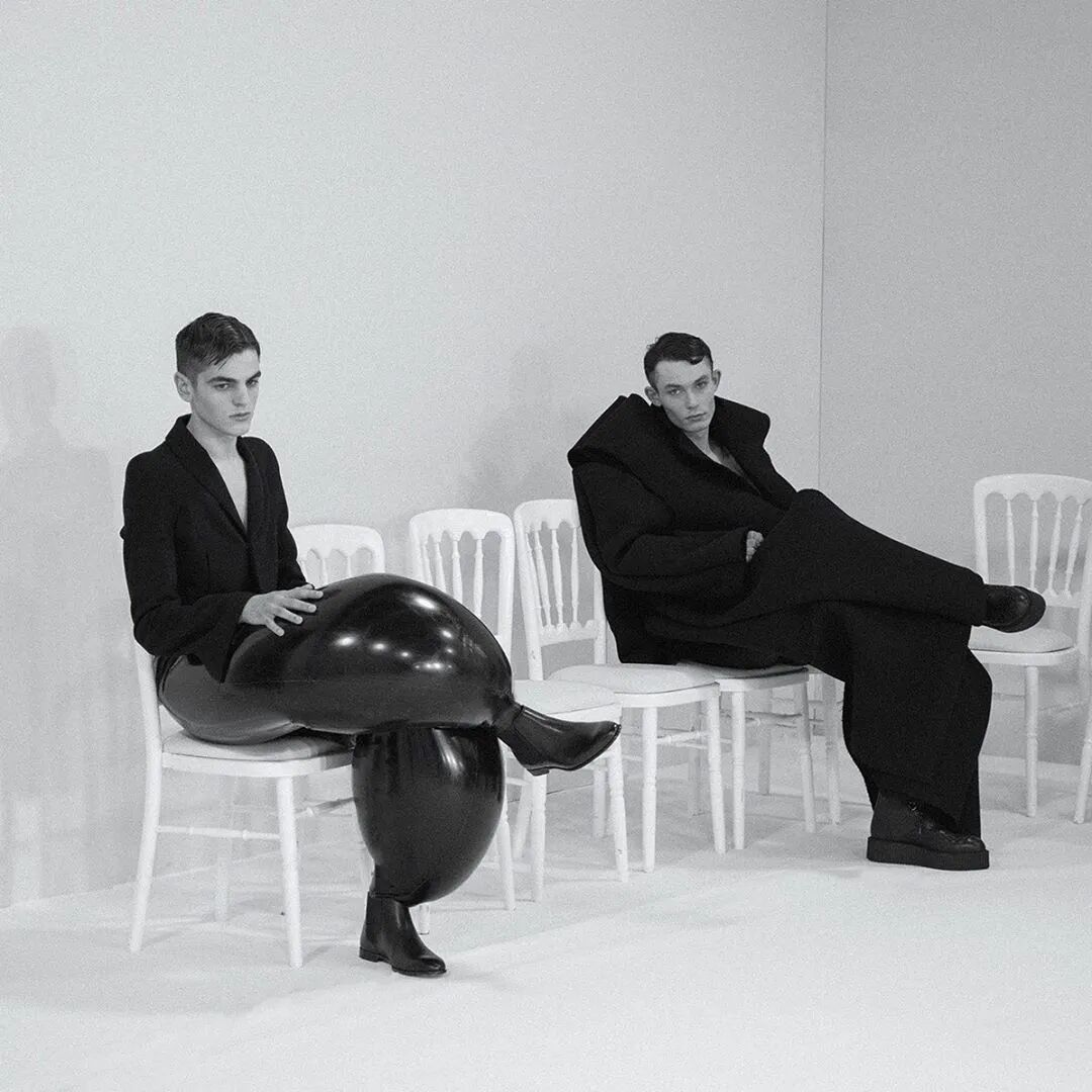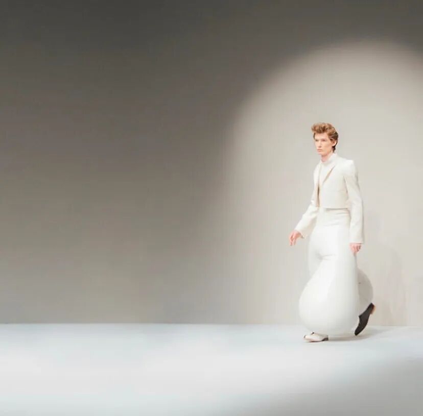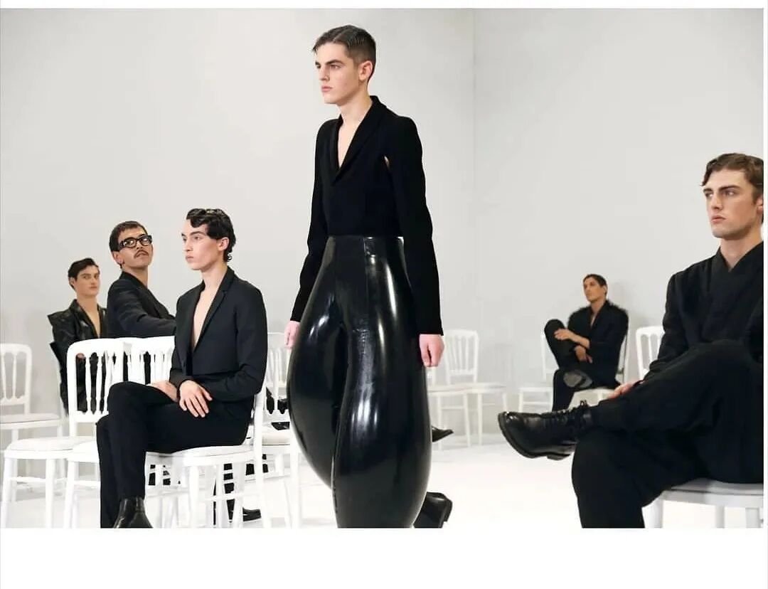 简洁剪裁的夹克、"圆滚滚"的乳胶长裤,穿上Harikrishnan设计的怪诞男装,模特们的步伐似乎都自带了鬼畜而又"弹力十足"的BGM。太过魔性简直让人想要报警捉妖的冲动