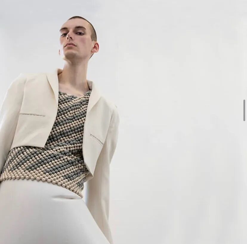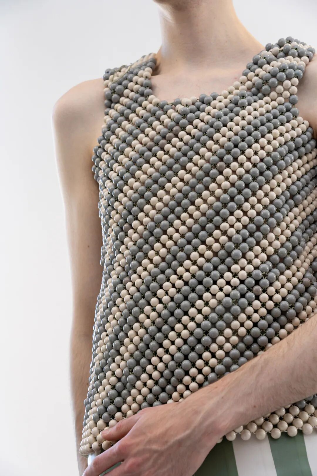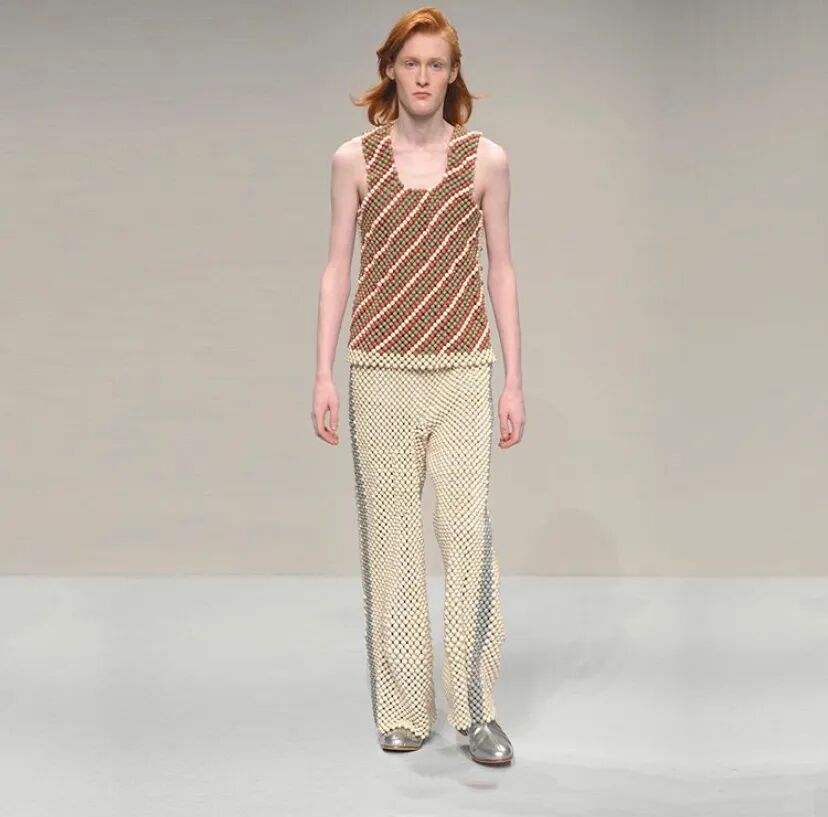 Harikrishnan的项目是关于对比的,包括视觉和材料。搭配夸张充气裤的是修身剪裁的夹克以及用手工雕刻的木珠串在一起的背心和短裤。